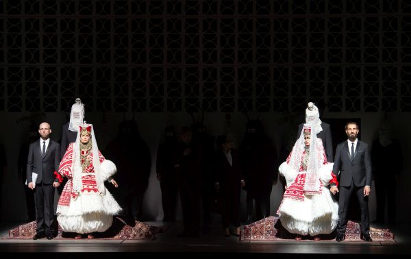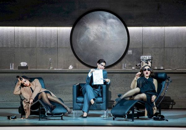 Am Ende werden sie dann erst in der Moschee mit üppiger albanischer Tracht beinahe erdrückt, bevor sie, wenn alles emotional zusammenbricht, im weissen Unterkleid und mit zerzausten Haaren wie Irre herumstehen. Beide singen vortrefflich, stürzen sich mit Emphase kraftvoll in die schwierigen Arien (den hoch artifiziellen Mozartgesang einer Schwarzkopf, einer della Casa, einer Ludwig, mit dem ich gross geworden bin, soll man nicht als Massstab anlegen, und würde auch nicht zu diesem Konzept passen, die Vergangenheit kann man auch mal ruhen lassen …), das ist alles prall, deftig und höchst wirkungsvoll in dieser Grundkonstellation. Despina wird von Rebeca Olvera mit wunderbarer Souplesse gesungen. In ihrem grauen Hosenanzug, der Kurzhaarfrisur, der Brille und dem Notizblock gibt sie die (bestechliche – Money transfer hat funktioniert) Analytikerin, die Psychologin, welche die beiden Schwestern berät, ihnen ihre Weisheiten nur so um die Ohren haut. Sie kennt sich auch mit Bildschirmpräsentationen (von Machismus über My pussy – my rules, zu Femen) bestens aus, und bringt – wenn die beiden Schwestern es gar nicht verstehen wollen – die Chose mit einer Skizze eines Penis auch mal ganz simpel auf den Punkt (Han gli altri ancora tutto quello ch’hanno essi – zu deutsch „andere Männer haben auch einen Schwanz“).