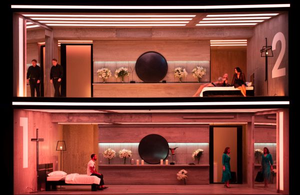 Selbstverständlich brauchte es zur Umsetzung dieses Konzepts Sängerdarsteller, welche auch vom Äusseren her überzeugend agieren können. Die standen in Zürich nun wahrlich zur Verfügung. Die beiden jungen Frauen Fiordiligi und Dorabella werden von Ruzan Mantashyan und Anna Goryachova umwerfend verkörpert. Hysterisch (Pumps werden schon mal an die Decke gekickt) schlittern sie auf der Achterbahn der Gefühle dahin, mal himmelhoch jauchzend, dann wieder zu Tode betrübt (aber ein Selfie mit der Urne des vermeintlich im Krieg gefallenen Freundes liegt natürlich immer drin). Beide sind mit Körpern gesegnet, die in jeder von Heidi Klums Shows problemlos siegen könnten, machen blendende Figur im (geschlechtergetrennten …) Fitnessstudio der ersten Szenen, in der Wohnküche, auf den Corbusier Liegen, Sesseln und Sofas, in der Luxusboutique beim Shoppen und natürlich in der schwarzen Reizwäsche im Schlafzimmer.