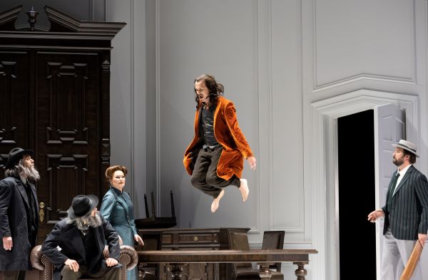 Ansonsten macht der Regisseur Andreas Homoki aus dem Rheingold eine eher brave Komödie, angesiedelt im Grossbürgertum, die Kostüme aus der Enstehungszeit des Werks. Diese Komödie allerdings gelingt dem Regisseur dank sehr genauer Personenführung ausgezeichnet, das ist streckenweise sogar ziemlich komisch. Die Götter sind allesamt regelrechte Deppen, Fricka noch die einzig einigermassen vernünftig argumentierende Figur. Loge ist ein quirliger Magier. Die Nachtalben kaum besser als die Lichtalben, trieb- und giergesteuert. Auch die beiden Riesen verfallen der Gier. Politisch etwas unkorrekt erinnern sie an Juden. Die märchenhaften, magischen Momente der Handlung werden ziemlich unspektakulär in Szene gesetzt. Wenn der durch Loge leicht zu manipuliernede Alberich sich mittels Tarnhelm in einen Lindwurm verwandeln soll, zieht er sich einfach in einen grossen Schrank zurück, die Türe schliesst sich, Rauch qualmt hervor, Türe öffnet sich wieder, Drachenkopf erscheint. Geschickt wird manchmal mit dem Schattenwurf der Gestalten auf den weissen Wänden gearbeitet (Licht: Franck Evin). Der Einzug der Götter in Walhall ist auch eine eher triste Angelegenheit, keine Regenbogenbrücke führt zur Burg, Göttinnen und Götter (und auch das Publikum) stehen erst geblendet durch weisses Licht aus dem Schrank da und die Götter schreiten dann ins nächste Zimmer. Das ist unterdessen immerhin zu einem grossen Saal geworden, mit gigantisch langem, goldenem Tisch. Man fühlt sich bei Putin im Kreml. Darum arrangieren sich die Götter, Donner und Froh flegelhaft, mit den Füssen auf dem Tisch, Wotan ist genervt von den Klagen der Rheintöchter. Loge setzt sich durch einen Sprung aus dem Fenster von den bedepperten Göttern ab, er ist ja der klügste von allen.