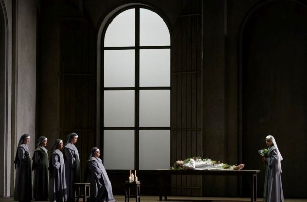 Die überragend eindringliche Personenführung durch Jetske Mijnssen kam vor den zumeist kahlen Wänden mit bewegender Eindringlichkeit zur Geltung. Diese Wände waren aber nicht immer kahl. Durch die filmschnittartige Abgrenzung (der Zwischenvorhang wirkte als schwarze Klappe) der einzelnen Bilder voneinander, wurde in den ganz kurzen Pausen auf der Bühne das Kunststück vollbracht, einzelne Wandmodule auszutauschen, da waren plötzlich Fenster und Türen in den Wänden, ein Durchgang zu einem feudalen Ballsaal wurde sichtbar, ein Klosterhof entstand, Licht strömte herein, später durchlebte man die Agonie der sterbenden Priorin, dann wieder befand man sich in der Kapelle oder im brennenden und vom Mob zerstörten Stadtpalais der Familie de La Force, am Ende bildete die Gefängniszelle der Nonnen in der Conciergerie das Setting für den Märtyrertod der Nonnen durch die Guillotine. Ihre bürgerlichen Namen waren mit Kohle an die Wände geschrieben. Sie standen eng zusammen, intonierten das Salve, Regina. Doch eine nach der anderen musste ihren Kopf auf das Schafott legen (das wurde natürlich nicht gezeigt, denn auch in den Regieanweisungen Poulencs steht geschrieben, dass nur der untere Teil des Schafotts sichtbar sein solle). Jetske Mijnssen hat nun einen noch beklemmenderen Inszenierungsansatz gefunden: Zu dem von Poulenc einkomponierten Niedersausen des Fallbeils neigt eine Nonne nach der anderen den Kopf, schreitet zur Wand, tilgt ihren Namen mit der Hand von der Wand und geht langsam ab. Am Ende bleibt die junge Soeur Constance (die zuerst gegen den Märtyrertod gestimmt hatte, diesen nun aber fast freudig erwartet) alleine zurück. Blanche (die sich zuvor ins brennende Haus ihres Vaters geflüchtet hatte) nähert sich Constance, ergreift ihre Hand und begibt sich dann nach dem Fallen von Constances Kopf als letzte zur Guillotine, das Deo patri sit gloria auf den Lippen. Die Vorhersage, welche Constance in einem Disput mit Blanche an der aufgebahrten Leiche der Priorin im zweiten Akt gemacht hatte, hat sich nun erfüllt: "… cette autre, lorsque viendra l’heure de la mort, s’étonnera d’y être si facilement, et de s’y sentir comfortable."