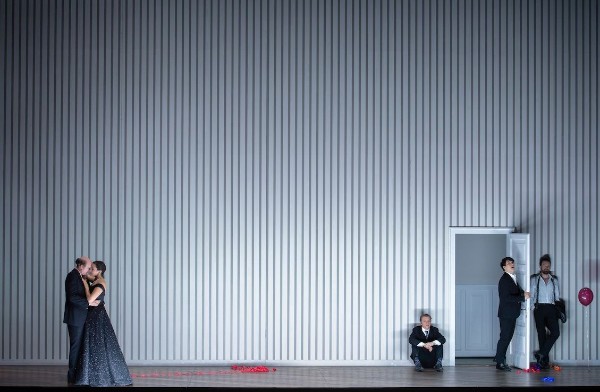 Mit der Ohrfeige im dritten Akt kam die Wende: Was vorher als mehr oder minder lustiger Schwank mit Kalauern und running gags – einfach im neuen Gewande, sprich in den eng geschnittenen dunklen Anzügen, die der Regisseur Christoph Loy so zu lieben scheint, dahergekommen war, bekam nun plötzlich eine berührende Tiefe in der Auslotung der Gefühle. Was war passiert? Sofronia (Norina) will noch in der Hochzeitsnacht den Ehemann Don Pasquale alleine lassen, in der eben erst für sündhaft teures Geld erstandenen schicken Abendrobe ausgehen. Als Pasquale ihr das untersagen will, schlägt sie ihn ins Gesicht. Was nun folgte, war ein kurzer Moment des Innehaltens (allerdings lacht das Publikum ausgerechnet in diesem Moment, der eigentlich sehr tragische Erkenntnisse und mixed emotions für Norina und Pasquale provoziert). Gerade in dieser Szene ist die ungemein präzise und tiefsinnige Detailarbeit des Regisseurs und seiner Protagonisten zu spüren. Was da (und auch schon in den ersten beiden Akten) an köstlicher und tragischer, scharfsinnig beobachteter Mimik und Gestik zu erleben ist, hat Ausnahmecharakter. Sowohl Johannes Martin Kränzle (Don Pasquale) als auch Julie Fuchs als Norina (beide übrigens mit Rollendebüts) faszinieren mit ihrem unendlich variantenreichen Spiel, mit Ausdrucksnuancen, die man nur ganz selten so intensiv auf der grossen Opernbühne erleben darf.