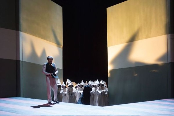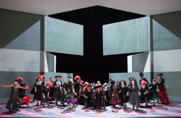 Auch der in dieser Oper so wichtige Chor ist hier eine krude Ansammlung von grotesken Gestalten, meist müssen die Sängerinnen und Sänger in gebückter Haltung, mit geknickten Knien über die Szene schleichen, genau wie das Trio infernale. Die Kostüme von Mechthild Seipel für den Chor und für Preziosilla, Melitone und Trabuco sind ganz grosse Klasse, alle in Schwarz gehalten, mit roten Accessoires (Schärpen, Krawatten, Haare …), die Gesichter auffallend weiss geschminkt, mit akzentuierten schwarzen Augenumrandungen. Das hat was Puppenhaftes (könnte von Achim Freyer sein), Bedrohliches, Marionettenhaftes – und passt zum kasperlehaften Touch, den die Inszenierung so kriegt. Was allerdings auf der Strecke bleibt, ist das Drama, die fatalen Beziehungen zwischen den Hauptpersonen werden kaum ausgeleuchtet, noch erhalten diese besonderes Profil. Weder Rassendiskriminierung, noch Standesdünkel, noch väterlicher Machtmissbrauch, noch kollektive Kriegslust sind ein grosses Thema. Wer also mit dieser Inszenierung der Oper zum ersten Mal begegnet, tut gut daran, sich vorgängig mit dem Inhalt auseinanderzusetzen. Für seine Sichtweise auf das Werk erhielt dann das Inszenierungsteam an der Premiere auch nicht nur Zustimmung.