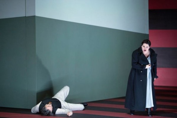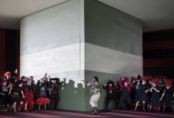 Nun das war es in der Tat, denn die vier riesigen Flügeltüren liessen unzählige Möglichkeiten der Raumaufteilung (und damit der Schauplatzveränderung, welche gerade in dieser Oper so häufig gefordert werden, wie in kaum einer andern) zu. Diese vier Wände konnten sich nach vorne oder hinten öffnen und schliessen, eine fest gefügte gerade oder gezackte Rückwand oder einen Kubus bilden (geometrische Körper auf der Bühne scheint Homoki zu mögen, so kann man den Chor rundherum jagen). Die Bühne war also wirklich „sophisticated“, aber auch ausgesprochen hässlich: Die vier Wände waren in einem graugrünen Farbton gestrichen (wie man sie von Armee-Panzern kennt, mit weissem Mittelstreifen, der wie eine Sicherheitslinie auf einer Strasse aussah). Boden und Bühnenabschluss nach hinten waren rot-schwarz gestreift, die Streifen auf dem Boden diagonal verlaufend, hinten auf der einen Seite vertikal, auf der andern horizontal. Aber natürlich passte diese unansehnliche Bühne ausgezeichnet zum Grundkonzept der Inszenierung, nämlich das Panoptikum des Welttheaters, welches diese grossflächig angelegte Oper Verdis auszeichnet, ins Groteske zu ziehen. Verdi hat wie kaum ein anderer seiner Zeit die Devise Victor Hugos (das shakespearsche Nebeneinander von Erhabenem und Lächerlichem, von Sublimem und Groteskem) in LA FORZA DEL DESTINO umgesetzt. Andreas Homoki dreht jedoch in seiner Regiearbeit diese Schraube vielleicht einen Dreh zu weit, indem er sich eben praktisch ausschliesslich diesem Schrillen, Absurden zu widmen scheint, die eigentliche Tragik des Geschehens links liegen lässt, das Ganze als einen albtraumhaften Verarbeitungsprozess Leonores sieht. So verschmelzen Homoki und sein Team wie erwähnt die Nebenrollen zu einem dauerpräsenten, dämonisch-diabolischen Trio, welches fies in die Handlung eingreift, dem Schicksal ganz konkret nachhilft.