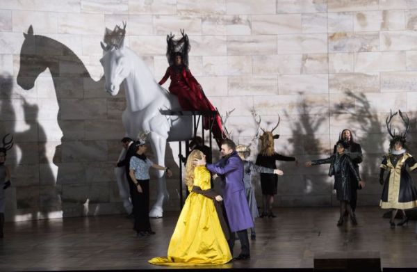 David Alden hat die Geschichte in seiner Inszenierung nicht historisch fixiert, davon zeugten nur schon die Kostüme (Gideon Davey), ein wilder Mix aus verschiedenen Epochen. Überzeugend gestaltet war die Farbdramaturgie in den Kostümen der beiden Protagonistinnen, Elisabeth zu Beginn in Schwarz, beim Aufeinandertreffen mit Maria dann in flammendem Rot, nach der Pause im schlichten weissen Unterkleid. Marias Kostüm war im erstem Akt ganz in senfgelben Tönen gehalten, zur Beichte erschien sie in schlichtem, hochgeschlossenem Grau, zur Hinrichtung trat sie in streng-katholisch schwarzem Kleid auf, das sie auf dem Richtblock fallen liess, um in flammendem Rot den Beilschlag des Henkers zu erwarten. Die ganze Handlung spielte sich ein einem Einheitsbühnenbild (ebenfalls von Gideon Davey entworfen), einem kalten, halbrunden Raum mit schmucklosen Marmorwänden, ab. Zur Veranschaulichung der Schauplätze dienten einige Versatzstücke, so die erwähnte Magerwiesen-Insel, die heutzutage unvermeidliche Uhr an der Wand im zweiten Akt, eine riesige Pferdestatue, die liegend als Platz für Elisabeths goldenen Thron diente und stehend effektvoll für ihren Auftritt in Fortheringay genutzt wurde, wo sie denn bald vom hohen Ross heruntersteigen musste. Diesen Auftritt begleiteten die Hofdamen allesamt mit Geweihen auf dem Kopf (auch Elisabeth trug eins), Symbol für die Damen als Freiwild oder sind sie gehörnte Opfer männlicher Ranküne und Untreue?
