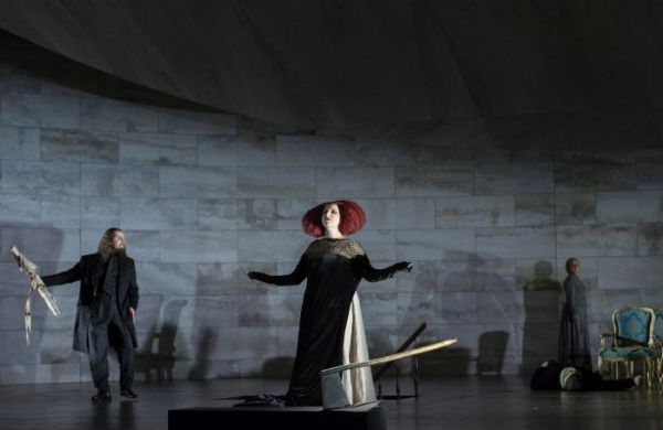 Nach der Pause drehte die Inszenierung zusehends ins Albtraumhafte. Lord Cecil, der schon im ersten Akt ständig als bleicher, Beil schwingender Rächer über die Bühne huschte, wurde immer stärker zur Horrorgestalt, ein unerbittlich Besessener im Stil eines Orest oder einer Elektra. Nachdem Elisabeth das Todesurteil für Maria aus den Fingern des Skeletts entrissen hatte, das sich im Finale I so furchterregend anstelle des Kronleuchters aus der Decke gesenkt hatte, begann Cecil aus dem Mund und den aufgeschnittenen Pulsadern zu bluten, und mit diesem Blut unterzeichnete Elisabeth das Todesurteil. Eine Erscheinung von skelettierten Königen (Macbeth lässt grüssen) hatte ihr zuvor quasi die Absolution für den Königinnenmord erteilt. Die Inszenierung schwankte also zwischen Realismus und Albtraum. Die hochdramatische Begegnung der beiden Königinnen auf der Wiesen-Insel geriet zu einem durchaus handfesten Kampf der beiden Frauen, der von den Machern des Denver-Clans hätte stammen können. Fehlte nur noch, dass Elisabeth und Maria im Seerosenteich landeten, wie weiland Krystle Carrington und Alexis Colby. Ganz stark war der Beginn der Oper inszeniert, zum kurzen Vorspiel kreisten die beiden Königinnen um die Krone Englands, die auf einem Stuhl in der Bühnenmitte platziert war, bedachten einander mit lauernden, vernichtenden Blicken. David Alden muss man zugute halten, dass er nie gegen den Text inszenierte, vieles war sehr gelungen umgesetzt, so der Auftritt Leicesters als Degenfechter, mit der in den Kampf involvierten Elisabeth, die sich nicht durch Männer bedrohen liess, ihnen mit Verve entgegentrat.