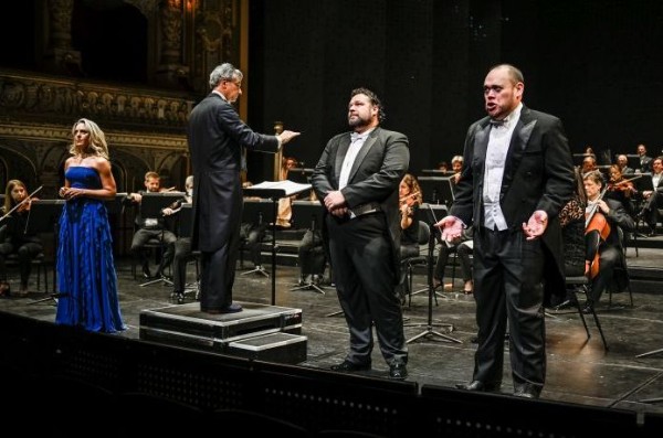Nach der Pause folgten zwei Ausschnitte aus SIMON BOCCANEGRA. Maria Agresta traf den schwebendn, flirrenden Ton der bezaubernden Auftrittsarie der Amelia Come in quest’ora bruna nicht ganz, klang zu „bodenständig“. Ganz anders dann das das Duett Boccanegra – Fiesco M’ardon le tempia aus dem letzten Teil der Oper. Hier erfüllten Quinn Kelsey (Boccanegra) und Alexander Vinogradov (Fiesco) alle Erfordernisse der subtilen, packenden Dramatik, welche sich zwischen zwei lebenslang verfeindeten tiefen Männerstimmen abspielen kann. Ein Höhepunkt des Abends! Der nächste folgte sogleich, der zwar stimmungsmässig überhaupt nicht zum vorangehenden tiefgründigen und charaktervollen Duett passte, aber vom Volumen her vom Sitz riss: Bryan Hymel mit der schmetternden, martialischen Stretta des Manrico Di quella pira aus IL TROVATORE. Bestimmt keine leichte Sache, da er sich nicht in den Choreinwürfen auf den (von Verdi nicht explizit geforderten, aber vom Publikum immer wieder gern erwarteten) Aufstieg zum tenoralen hohen C-Himmel vorbereiten konnte, doch Hymel schaffte dies mit begeisternder Souveränität. Danach erneut ein gewaltiger Bruch hin zur introvertierten Arie des Filippo II. aus DON CARLO, Ella giammai m’amò. Die Philharmonia Zürich spielten die chromatisch und kontrapunktisch von Verdi weit in die Zukunft weisende Introduktion mit der tristen Cellomelodie mit herausragender Transparenz. Alexander Vinogradov verlieh mit seiner zu Beginn gekonnt fahlen Tongebung der Arie die erforderte Tiefe der Interpretation, steigerte sich grandios ins verzweifelte amor per me non ha. Meisterhaft und bewegend. Zum Abschluss des ohne Zugabe beendeten Konzerts (Gottseidank folgte nicht noch das obligate Brindisi aus LA TRAVIATA!) dann noch das Terzett Tace la notte aus IL TROVATORE, in welchem Maria Agresta, Bryan Hymel und Quinn Kelsey mit handfestem Verdi-Gesang vom Feinsten auftrumpfen konnten und Maria Agresta mit lange gehaltenem As den Abend triumphal beendete.