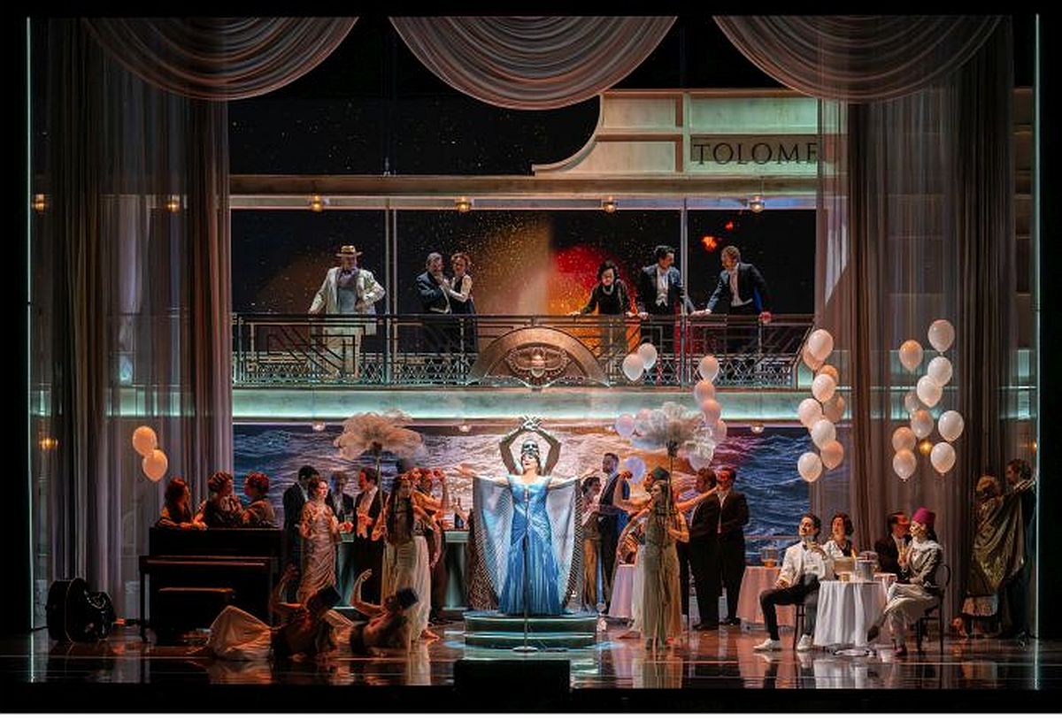 Regisseur Davide Livermore lässt den Mythos der Begegnung zwischen Julius Cäsar und der ägyptischen Thronaspirantin Cleopatra auf einem Nildampfer der 1920/30er Jahre spielen, so ganz im Stil von John Guillermins Agatha Christie-Verfilmung DEATH ON THE NILE. Das ist bombastisch inszeniert, ohne ab und an das ironische Augenzwinkern zu vergessen. Von der genau beobachteten Einschiffung der Passagiere, mit all den Minidramen, die sich dabei abspielen, bis zur aufregend inszenierten Choreografie des Schlussapplauses, bei der man beinahe in Musical-Stimmung gerät, zeugt diese Arbeit von einer klug durchdachten, mitreißenden und hochspannenden Lesart. Dabei kommen weder einige die ägyptischen Plagen (Wasser wird zu Blut, Hagel und Sturm, Ju88 Bomber anstelle von Heuschrecken) zu kurz, noch wird die kriminalistische Erzählung vernachlässigt. Ein stummer Chronist/Regisseur (wie damals Peter Ustinov als Hercule Poirot) notiert sich die Aufführung hindurch die berühmten Zitate Cäsars („Cesare venne, vide e vinse“), fotografiert und filmt und stellt das Ergebnis seiner detektivischen Chronik während des Schlussapplauses den Passagieren und uns im Publikum als witzig überdrehten Schwarzweiß-Stummfilm vor. Fabelhafte Unterstützung erhielt Livermore durch die von Giò Forma entworfene Konstruktion des Schiffsdecks mit Kommandobrücke, Salon und Festsaal, den Hintergrundkulissen mit all den Sehenswürdigkeiten Ägyptens und postapokalyptischen Landschaften mit gestrandetem Dampfer im Wüstensand, den fantastischen Kostümen von Mariana Fracasso (inklusive Anspielungen auf Kostüme im Film CLEOPATRA von Mankiewicz, mit Liz Taylor), der grandiosen Lichtgestaltung von Antonio Castro und vor allem den packend eingesetzten, atmosphärisch einzigartigen Videos von D-Wok (Leiter dieser Compagnie ist Paolo Gep Cucco). Die dunkel dräuenden Wolken, die gefährlich wogenden Wellen, die Bomberangriffe, die Explosionen und das sich blutrot färbende Nilwasser verfehlten ihre Hollywood-Wirkung nicht.
