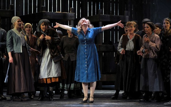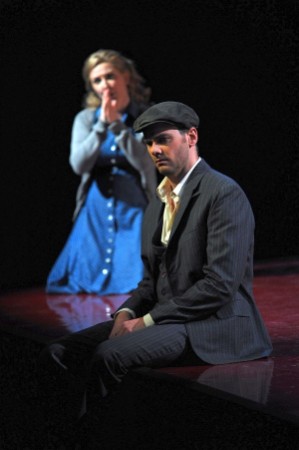 Der musikalische Teil des Abends überzeugt da eher. Der von Ulrich Nolte einstudierte Chor hat in der „Halka“ nicht nur ordentlich zu singen, sondern auch zu tanzen (Choreografie: Lillian Stillwell), geht mit reichlich Spielfreude ans Werk und überzeugt da wie dort auf ganzer Linie. Im schwungvoll dargebotenen Lied der Bergbauern im dritten Akt gelingt so – neben Halkas Gebet im zweiten und Jonteks Arie im dritten Akt – der musikalisch eindrucksvollste Moment des Abends. Ein positives Resümee ist außerdem nicht zuletzt den mitunter ausgezeichneten Solisten zu verdanken. Arlette Meißners Halka besticht durch wunderbar warme Töne und hinreißend gefühlvolle Pianissimi. Ihr nimmt man die naiv Liebende ebenso ab, wie Alexander Geller den unglücklichen Jontek. Sein metallisch klingender Tenor mag nicht jedermann gefallen (mir schon!), passt aber hervorragend zur Rolle und verfügt über tolle Facetten und viel Gefühl. Erprobter Gast am Haus ist Bernd Valentin, der den Gutsbesitzer mit kraftvollem Bariton anlegt, der warme Mezzo der jungen Amerikanerin Jennifer Feinstein klingt wunderschön, passt aber stimmlich nicht ganz zu Halkas kalter Rivalin Sophie. Ihr Vater wird von Ensemblemitglied Alexis Wagner über weiter Strecken mit überzeugender Tiefe verkörpert, ebenso routiniert tritt Daniel Böhm als ambitionierter Verwalter Dziemba auf. Komplettiert wird das Ensemble durch Daniel Ewald und Jacek Jacunski in den kleineren Rollen.