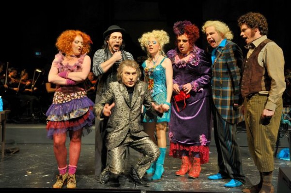 Die Solisten, immerhin neun an der Zahl, viel mehr als sonst bei Belcanto-Opern üblich, machten durchweg gute Figur und gute Stimme. Obwohl in dieser musikalischen Adaptation die ganz großen Anforderungen des Belcanto nicht gestellt werden, bleibt doch noch genügend Virtuoses zu bewältigen und das bei hohen schauspielerischen Leistungen. Für die Titelrolle („Agate“) war Wieland Satter engagiert. Der beherrschte die Szene von seinem ersten Auftritt an durch seine mächtige Figur und seinen komödiantischen Spielwitz, der weit über den einer Knallcharge hinausging. Stimmlich nahm sich sein beweglicher und sonorer Bassbariton dazu genauso gut aus. Die Primadonna mit dem schönen Namen „Corilla Sartinecchi“ gestaltete die gertenschlanke Monika Hügel, hellblond herausgemacht, und brachte ihren silbrig hellen Sopran zur Geltung, auch in forcierten Höhen ohne Schärfe und mit schöner beweglicher Koloraturtechnik. Als zweite Sopranistin („Luigia Boschi“) war Arlette Meißner besetzt; ihre etwas dunkler timbrierte Stimme setzte sich von der prima donna gut ab und gefiel mit ihrer samtigen Intonation. Sie wurde dauernd von ihrer Mutter Agate bevormundet und suchte daher Rückhalt bei anregenden Getränken.