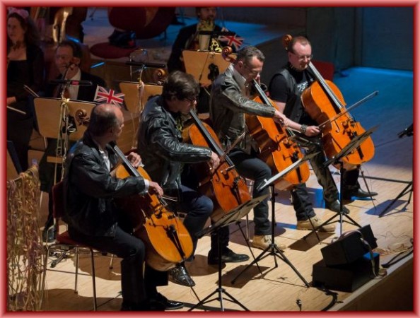 Im seriösen ersten Teil zeigten sich Chor und Musiker noch im klassischen Outfit. Man gab – versteht sich – natürlich die bekannten Englischen Klassiker "Halleluja" (Händel), "Christmas Dance & Greensleaves" (Vaughan Williams) sowie die Madrigale "April is my Mistress Face" (Morley) und "The Shower" (Elgar). Einen Vorgeschmack auf den zweiten Teil des Abend boten die „Vier Cellisten“ der Essener Philharmoniker – sihe Bild unten – mit "Yesterday" (McCartney); später ließen sie den Saal mit "Smoke on the water (Deep Purple) im Lederoutfit regelrecht rocken…