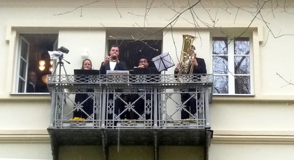 Den Beginn machte, sozusagen pünktlich zum Einzug, das Bläserquintett der Sächsischen Staatskapelle, die am vernieselten Sonntagnachmittag vom Balkon herab vier Arrangements von Festmusiken spielten, die von einer Kurzfassung der 1943 komponierten Festmusik der Stadt Wien von Richard Strauss eingeleitet wurde – womit Dresden (bekanntlich auch einer der bedeutendsten Strauss-Uraufführungsorte), Richard I., der gelegentliche Bayreuther Festspiel-Dirigent Richard III. (wie Strauss sich in Bezug auf Wagner selbstironisch nannte) und Fantasie elegant verbunden wurden. Straussens Festmusik verleugnet trotz oder gerade: aufgrund ihres Gelegenheitscharakters an keiner einzigen Stelle, dass sie das Werk eines Meisters ist; dass man am Sonntag wenigstens ein Drittel davon in einer praktikablen Miniaturbesetzung hörte, war schon bewegend genug.