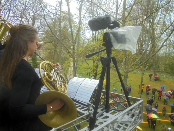 „Gänsehaut“: das meinte Adrian Indlekofer indes, natürlich, erst, als die fünf jungen Leute mit den Wagner-Stücken begannen: dem Parsifal-Vorspiel, dem Einzug der Gäste, Elsas Prozession zur Kathedrale und schließlich dem Meistersinger-Vorspiel. Alberto Antonio López (1. Trompete), Anton Winterle (2. Trompete), Marie-Luise Kahle (Horn), Jonathan Nuß (Posaune) und Constantin Hartwig (Tuba) gehören auf je eigene Weise, als Mitglieder oder Akademisten etc., der Sächsischen Staatskapelle an, die seinerzeit drei Wagner-Opern aus der Taufe hob; die ingeniöse Idee, ein Bläser- und nicht ein Streichquintett als Freiluftmusik nach Fantaisie zu schicken, war naheliegend, aber nicht selbstverständlich (die Streicher kamen eine Woche später: als Innenraummusik).