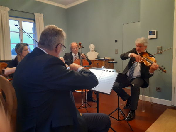Schließlich der Höhepunkt – also der Höhepunkt für einige wenige Zuhörer, die das Glück hatten, in einem als Festkonzert überschriebenen Ereignis am Sonntag dem Voyager Quartet zu lauschen. Vier Musiker, elf Zuhörer – mehr geht kaum in diesen kleinen Räumen. Das Voyager Quartet ist in Bayreuth nicht unbekannt; 2020 spielte es in Haus Wahnfried sämtliche Beethoven-Quartette, 2020 wurde am selben Ort eine CD eingespielt: mit bearbeiteten Wagner-Werken. „Recomposed“ nennt der Bratschist Andreas Höricht das, so dass wir die Wesendonck-Lieder, einige Sequenzen aus der Götterdämmerung und dem Parsival hören (so, auf den mittelalterlichen Stoff anspielend, nennt der Bearbeiter das). Nur das Tristan-Vorspiel bleibt von Eigentönen unangetastet; es klingt hier filigran wie ein Gespinst aus Seidenfäden. Radikal aber gehen Nico Christians, Maria Krebs, Andreas Höricht und Klaus Kämper mit Wagners letzten beiden Musikdramen um. Die Partitur wird zum Steinbruch für Collagen und Übermalungen, wie sie Wagner selbst mit Hilfe seiner eigenen Erinnerungstechnik praktiziert hat, also für Neukompositionen, die im „Ton“, wie Alban Berg das genannt hat, und in ihrer expressiven Gespanntheit ein wenig an die Wiener Schule eines Arnold Schönberg erinnern. Ab dem Vorspiel zum dritten Parsifal-Akt bewegen wir uns in einer notengetreuen, dann in einer verkürzten Version des Finales, in dem die Schroffheiten von Parsifals Wanderung durch die Öde rasch und luftig aufgelöst werden. Die emotionale Dichte wird in den kleinen Räumen noch deutlicher, als sie es eh schon ist.