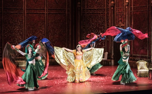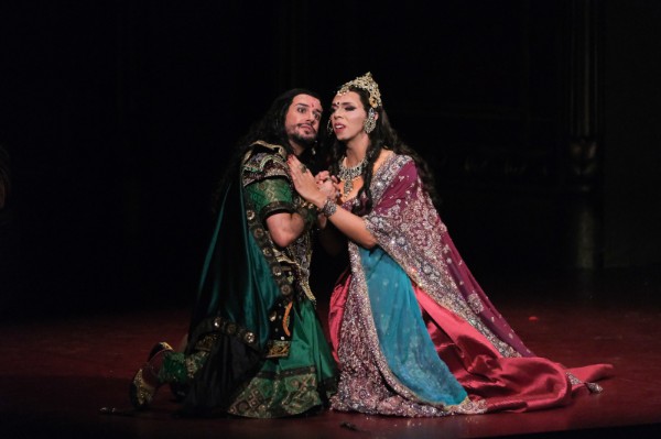 Jubel über Jubel also über die Virtuosität, mit der schon der Kostümbildner Giuseppe Palella die Figuren beschenkt hat. Er organisierte die Stoffe aus Nordindien und Italien, konkret: Venedig, wo man heute noch alte, extrem wertvolle und gute Stoffe kaufe kann, er sorgte für ausgesprochen satte Farben, herrliche Muster, leuchtende Kombinationen, die in die von Domenico Franchi gebaute und von David Debrinay wunderbar warm ausgeleuchtete Bühne – und die kleine Bühne auf der Bühne – integral hineinpassen. Es ist schon ein Vergnügen, Cleofide auf offener Bühne von einem schönen roten zu einem noch schöneren grünen Kostüm wechseln zu sehen; überhaupt herrscht am Abend das Prinzip der Steigerung, wo von Akt zu Akt die Körperausstattung leuchtender, glänzender, vornehmer wird. Wenn Erissena mit Goldflügeln singt und tanzt und von Tüchermännern umschwärmt wird, wenn die Protagonisten auf großen Dreirädern mit Tier-Vorderteilen hereinfahren, wenn die schönsten Stoffe die intensivsten Farben und koloristischen Kombinationen aufweisen und sich die Sänger noch dazu wunderbar in ihnen bewegen, weil der indische Choreograph Sumon Rudra und der Regisseur Max Emanuel Cencic ein Gefühl für Timing und Bewegung haben – dann ist das Glück der Zuschauer und -hörer vollkommen. Die Lyrik einer Cleofide-Arie, die arienmäßig kontrollierten Wutanfälle eines Poro, die Traurigkeit selbst einer Erissena, die leicht klamaukigen Szenen zeigen Alessandro nell‘ Indie als Barock-Musical, in dem die Musik aus dem Geist des Tanzes entsteht und das ausgesungene Sentiment für die nötigen Ruhepunkte sorgt. Man springt am Ende, wie in einem guten Boulevard-Stück, aus vielen, vielen Kisten, man präsentiert als sakrales Stück das gute eine großen, goldenen Phallus (der bei Metastasio definitivv nicht vorkommt): das passt schon. Wo für genügend Kontraste gesorgt ist – wie in einem guten Bollywood-Film, der mit der „ernsten“ Oper mehr zu tun hat als man als Kultursnob gewöhnlich meint – ist Komik ein probates Heilmittel gegen die Verzweiflung.