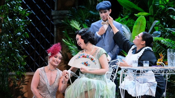 Er entzündet sich auch an der Tatsache, dass Cencic zusammen mit seinen kongenialen Mitstreiterinnen die grandiose Idee hatte, die nur auf den ersten Blick verwirrende Handlung in das in jedem Sinne abblätternde Kuba der 20er Jahre zu verlegen, also dem Spielort einer möglichen telenovela. Giorgina Germanou entwarf den Bühnenraum samt herrlichem Palmengarten bei Nacht, Maria Zorba die stilsicheren Kostüme mit und ohne Glanz und Glitter, Dimitra Antonaki die schicke Choreographie. Erinnerungen an Miss Fishers mysteriöse Mordfälle, in denen die Killer so schick auszusehen pflegen wie in kaum einer anderen Epoche der Geschichte und die Frauen schlicht und einfach trendy sind, kommen nicht nur auf, wenn ein Oldtimer auf der Bühne steht, um den herum das Geballer anfängt. So spiegelt sich das Pathos und die große Geste, auch die Schäbigkeit der „Bösen“ im leicht abgewohnten Ambiente eines Herrenhauses, das schon bessere Tage gesehen hat, und in dem ein Bodyguard als Gangster Karriere machen kann. Wo der Patriarch selbst einer der größten Ganoven ist, wird das Barockdrama gleichsam zur Kenntlichkeit entstellt: oft mit einem Augenzwinkern, öfter noch mit einem echten Pathos, das zuletzt, vor dem üblichen Fest, bezwingend kulminiert. Viereinhalb Stunden lang hören wir Arien und Rezitative – dann plötzlich, o Wunder, hören wir, wie sich zwei Stimmen zärtlich ineinander verschlingen. Endlich kommt zusammen, was zusammen gehört. Julia Lezhneva und Franco Fagioli bezaubern das Publikum, und wir verstehen, dass das Liebesduett der Verzweifelten, das zum ersten und bis dato letzten Mal im Jahre 1738 in Rom erklang, nicht von Gestern ist. Schon gar nicht, wenn ein Ensemble wie die Armonia Atenea unter George Petrou die wieder zum Leuchten gebrachte Partitur mit Verve, aber doch auch so spielt, dass man keine Angst um die Darmsaiten haben muss: mit Pauken, zwei Hörnern und einer Trompete, die nicht allein in der Ouvertüre für schroffen Glanz sorgen; die Pauke ist auch im dramatischsten Rezitativ des Abends, wenn es buchstäblich um Leben und Tod geht, effektvoll dabei.