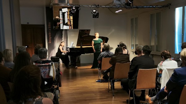 Warum ich diese eher einschränkenden und nicht gerade höflichen Bemerkungen an den Beginn einer Konzertkritik setze? Weil die junge Sängerin, die zusammen mit ihrer höchst kompetenten Begleiterin, Mitspielerin und Mitinterpretin Elitsa Desseva in Steingraebers Kammermusiksaal mit dem Programm Von ewiger Liebe ihr Bayreuth-Debüt erlebte, die allzu werbenden Worte auf dem Waschzettel des Programms gar nicht nötig hätte. Gewiss: Man und Frau müssen heute im internationalen Konzert der Musiktalente mächtig trommeln, um auf sich aufmerksam zu machen; gute Sängerinnen wie Vera Maria Bitter dürfen auch in der „Musikstadt“ Bayreuth nicht erwarten, in einem ausverkauften Saal zu stehen – dabei hätten die beiden Musikerinnen ihn verdient. Denn schon mit dem Introitus des dreiteiligen Liederabends nehmen sie die Zuhörer gefangen. Im zweiten Teil aber wird, den komplett anderen Liedern angemessen, die Stimme anders klingen, im Schlussteil sich die Sängerin, wollte man es überspitzt und ungerecht auf den vokalen Punkt bringen, endlich völlig eingesungen haben, obwohl die Vermutung, dass hier eine zukünftige „Strauss-Sängerin“ zu hören ist, noch nicht geäußert werden sollte. Denn die durchaus schöne, charaktervolle, stets vorbildlich klar artikulierende Stimme, bei der akkurat jedes Wort – selbst in den hohen Sopranregionen – verständlich bleibt, ist in den ersten vier Schubert-Liedern hell, scheinbar leicht, doch tragend – vergleicht man diese Gesangs-Art mit jener, die sie im längeren Brahms-Zyklus anwendet, klingt Vera Maria Bitters Stimme zunächst konturiert wie ein hauchdünnes Blatt Papier, das durch den Äther fliegt, ihn zart zerschneidet und unsere Ohren erreicht (dies nur als Versuch, die klare Stimme mit einer vielleicht missverständlichen Metapher zu beschreiben). Der Sopran sitzt, er folgt den Intervallsprüngen, den Worten und dem genauen Sinn des zauberhaften Eingangs An Sylvia wie selbstverständlich; der Ambitus der Ausdrucksformen wird mit dem weltlichen Gebet Du bist die Ruh, der erzählenden Romanze und der dramatischen, schon tiefer gelegteren Ballade Der Zwerg ausgezirkelt. „Schubert singt in innerem Bezirk“, wie Dietrich Fischer-Dieskau in Zusammenhang mit Du bist die Ruh einmal sagte. Voilà, man hört es an diesem Abend. Vernimmt man dann die sieben Brahms-Lieder, erweitert sich das Spektrum der Stimme ins eindeutig Dunkle: Von ewiger Liebe op. 43/1 ist ein glänzender, mahlerisch anmutender, ins zweifache Forte ausgreifender Beginn in der Reihe dieser typisch bramsschen, also unlustigen und tiefgründenden Lieder, in denen die Sängerin große Bögen bilden kann (und bildet). Ein alter Traum erfasst mich und führt mich seine Bahn – die Alte Liebe op. 72/1 fasst zusammen, was das Ethos dieser Lieder ausmacht und Vera Maria Bitters Stimme in diesem Teil so vollkommen erfüllt, dass man den Eindruck haben könnte, dass sie im abgeschatteteren Repertoire vielleicht (!) eher zuhause sein könnte als in den alpinen Extase-Landschaften eines Richard Strauss – obwohl auch dessen Lieder gelingen, weil Bitter und Desseva, letztere mit großem, doch für die Nuancen der Singstimme meist aufmerksamem Gestus, den Strauss-Ton harmonischer Leidenschaften, wie gesagt: mit ihren Bögen bezwingend hinbekommen.