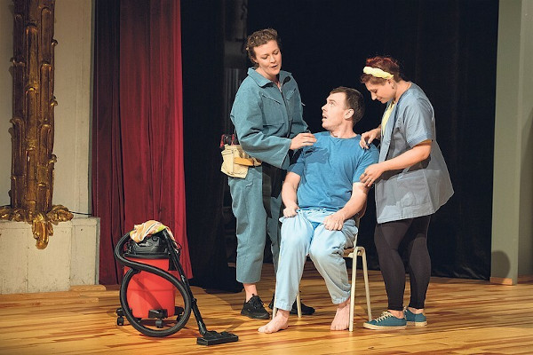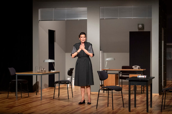 In Polifemo war sie eine wunderbare Circe, während Maria Ladurner dort die Venere sang (in Nürnberg war sie vor kürzerer Zeit die sich emanzipierende Frau des alten Deppen Pimpinone), nun spielt sie eine der „Angestellten“, in die sich der komische Held beim ersten Anblick sofort verknallt. Maria Ladurner macht in der Blaufrau der Bürohandwerkerin Ruspolina vokal wie gestisch die beste Figur – gleichermaßen attraktiv agiert die facility managerin Cetronella der Benedetta Mazzucato: schön, was da an Schmelz aus ihrer Kehle dringt, und sehr erheiternd, wie sie das Gespräch zwischen einer Tochter, die einen passenden Mann haben will, und ihrer Mutter, die derlei Ansprüche eher zurückweist, dialogisch aussingt. Cetronella und Ruspolina zanken sich selten, tun sie‘s, darf man getrost, zumindest von Ferne, an Susanna und Marcellina denken.