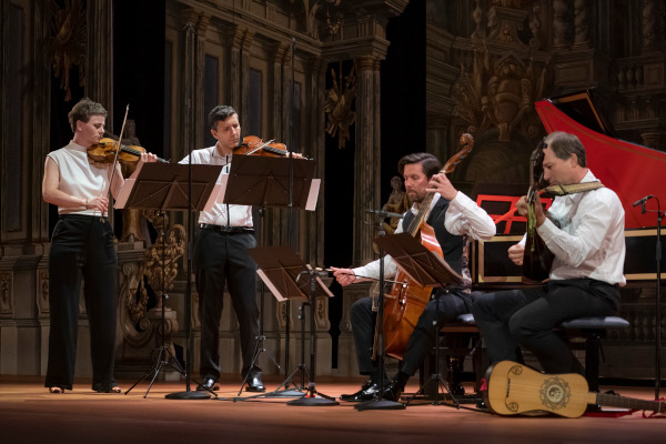 Martina Pastuzka (1. Violine), Adam Pastuszka (2. Violine), Krzysztof Firlus (Viola da Gamba), Anna Firlus (Cembalo) und Jan Čižmář (Theorbe und Barockgitarre) zeigen mit Verve und Grazie, dass es „die“ Barockmusik nie gab und die Werke, die spätestens ab der Mitte des 18. Jahrhunderts, dh: ab der Erbauungszeit des Markgräflichen Opernhauses, entstanden, nur schwerlich einem orthodoxen barock-Begriff untergeordnet werden können. Dass sich ein Konzert von Vivaldi so stark von der Musik Händels unterscheidet wie eine Suite Zelenkas von Bachs Ouvertüren wie das südamerikanische Tropen- und Pflanzenbarock vom norddeutschen Stil und das niederbayerische Bauernbarock fundamental vom Würzburger Imperialstil: man weiß es inzwischen, aber es braucht derartige Konzerte, um auf den Reichtum der Stile selbst bei den sog. „Kleinmeistern“ hinzuweisen. Eine Entdeckung sind an diesem Abend nicht allein die Triosonaten des bayerischen Kurfürsten Maximilian Joseph III von Bayern, die, so David Treffinger, der Dramaturg des Festivals, ein Spiegel seines bürgerlichen Bewusstseins sind. Schlicht klingen sie deshalb noch lange nicht, oder anders: Ja, was man so „schlicht“ heißt, wenn es kultiviert in das Musikzimmer der Residenz klingt. Das mit einem Furioso beginnende Konzert, mit dem zugleich die 6. Sonate – sie steht in der Glückstonart G-Dur – anhebt, eröffnet einen kurzen und guten Satz, nach dem (auch) die Cembalistin einfach nur lächeln kann. Sehr empfindsam, also modern im Stil der Epochen, ist die Melodie des Adagio über den ruhigen Grundbassvierteln, und ländlich, eine künstliche Schäferwelt vorstellend, tönt schließlich das Finale (dass es sich laut Programmheft beim Schlusssatz der 10. Sonate in C-Dur um ein Menuett handelt, ist ein Gerücht), aber hier wie dort regiert der „vermischte Geschmack“, gewirkt aus deutschen und italienischen Elementen: die Moderne des sog. Spätbarock. Schlicht zauberhaft aber ist das Adagio der C-Dur-Sonate, sordinierte Violinen wiegen sich im piano-Sechsachteltakt, nachdem uns die Wiener Terzen des Allegro davon überzeugt haben, dass „Einfachheit“ etwas sehr Schönes sein kann (wir bitten um eine Ersteinspielung).