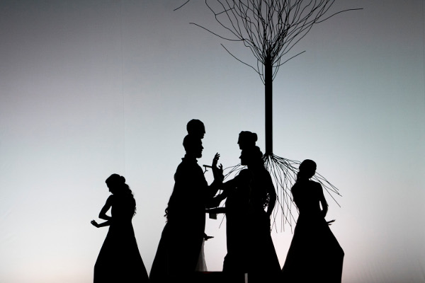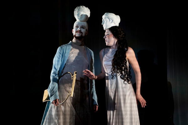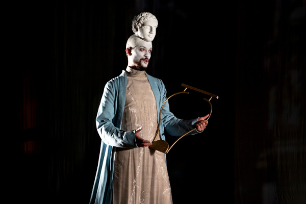 Schön sind auch die Silhouetten, die das Licht (Daniel Tesař) ausschneidet, wunderbar ist die Stimmung, wenn hinter dem duettierenden Liebes- und Hochzeitspaar die Hirten, zart beleuchtet, hinter dem Gazevorhang stehen und später die Nacht sich in die Unterwelt senkt, in der der Fährmann sich hinter einem bootshohen, bühnenbreiten Schleier im Fluss der Unterwelt vor Orfeos Gesängen windet, um schließlich von eben diesen eingeschläfert zu werden. Großartig der Gang in den hades: eine symmetrisch ausgerichtete, von den verstärkten Chören und den Trommeln eindrucksvoll akkompagnierte Todes- und Videofahrt durch die Unterweltsgewölbe einer Theaterarchitektur der Renaissance. Kommt hinzu, dass alle Personen einen kleinen weißen, also marmorimitierenden Kopf auf ihren eigenen Köpfen tragen: ein fast surrealer, doch sinnvoller Einfall, denn in dem Moment, in dem die „Messagiera“ Sylvia der Feiergesellschaft die Nachricht vom Tod der frisch Verheirateten bringt, bringt sie ihnen zugleich den kleinen Kopf, den Euridice vorher trug: ein Symbol, zugleich etwas sehr Reales – das Sterbliche, das gleichzeitig an das antike Vorbild erinnert, dem diese Figur im Jahre 1607 und noch heute ihre Existenz verdankt(e).