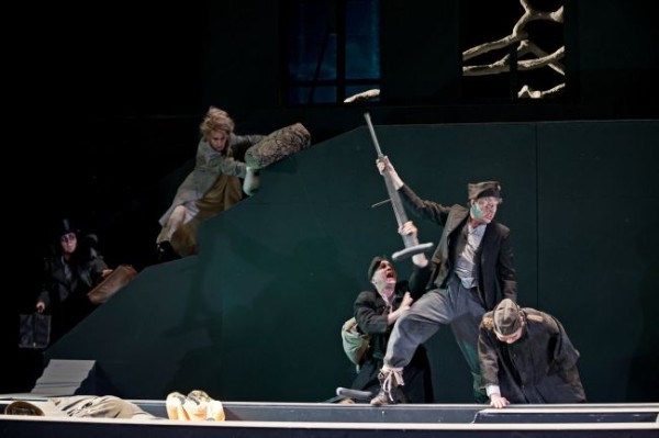 Dazu hat Neuner auch selbst ein geeignetes Bühnenbild entworfen, das aus einem breit über die Bühne reichenden Gemäuer mit drei Ebenen besteht. Es könnte ein vom Krieg beschädigter Industriebau oder auch verfallende Herrschaftsarchitektur sein. Susanne Hubrich hat die Akteure überwiegend in schlichte Kostüme oder schmuddelige Uniformen gesteckt. Der Einäugige, der Einarmige und der Bucklige sind Kriegsinvaliden. die irgendwie ihr Leben fristen. Das von Barak organisierte Festmahl besteht aus einer bescheidenen Menge zusammenorganisierter Lebensmittel. Der Kaiser und sein Falke fallen aus dem Rahmen, aber nicht ganz: der Falke kriecht in historischer Uniform mit einer zerfetzten österreichischen Kriegsfahne über die Bühnenstrukturen, wenn er sein „der Kaiser muss versteinen“ singt; letzterer ist in einen noblen Renaissance-Mantel gekleidet. Hier wird sichtbar, wie weit es im Habsburger-Reich von Carolus Quintus bis Kaiser Franz-Joseph gekommen ist. Die Bevölkerung vegetiert im Dreck des Kriegs. Vor dem Gemäuer liegt ein toter Soldat mit dem Kopf neben der Kriegsadler-Fahne und seinem Stahlhelm in einem Wassergraben, der dem Färber auch zum Spülen seiner Ware dienen könnte. Geisterbote, Amme, Kaiser und Kaiserin treten auf den oberen Ebenen auf, die normalen grauen Menschen müssen unten um ihre Existenz kämpfen. Das versöhnliche Ende mit dem klassischen Jubelgesang (es darf sogar die verjagte Amme hier zumindest szenisch mittun) findet vor dem Parterre im „Abgrund der Menschenwelt“ statt; Gleichheit lässt sich eben immer nur auf unterstem Niveau verwirklichen…