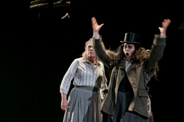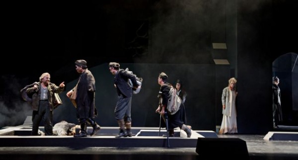 hinten: Dalia Schaechter (Amme); und Marion Amann (Kaiserin) auf dem Abstieg zu: János Ocsovai (Buckliger), Markus Jaursch (Einäugiger), Hiroshi Matsui (Einarmiger)
