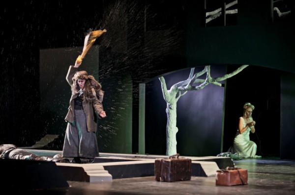Obwohl die Inszenierung mit der Beziehungssetzung zum Krieg eine weitere Ebene von Symbolik schafft, rückt der symbolhafte Gesamtgehalt des Stoffs, „für den Hofmannsthal ausgiebig im Motivfundus der Weltliteratur plünderte“ (die Dramaturgin Caroline Scheidegger im Programmheft), durch die wahrhaftige, wenig märchenhafte, und leider real existierende Welt, die auf der Bühne gezeigt wird, in den Hintergrund. Der tote im Wasser liegende Soldat entpuppt sich szenisch als der verführerische Jüngling (von irgendwo her gesungen), Märchenfiguren werden nur annäherungsweise gezeigt: die Amme als böse Fee mit Zylinder und von Fuchspelzen umbaumelt, die Kaiserin hell gekleidet als gute Fee. Diesem Dualismus ist das niedere Paar mit seinen Begleitfiguren ausgesetzt. Das gute Ende wird durch die richtigen Entscheidungen der Kaiserin und der Färberin herbeigeführt. Aber der Ausblick bleibt trüb. Weiterhin laufen Figuren mit Gasmasken über die Bühne, die von grauen Flüchtlingsgestalten bevölkert ist, von denen eine gar mit einem alten Kinderwagen Kinderleichen eingesammelt hat. Sollte die wiedergewonnene Liebe und Fortpflanzungsfähigkeit (beide Frauen haben ja am Ende einen eigenen Schatten) nun nur dazu dienen, dass die (noch) ungeborenen Kinder wieder Kanonenfutter werden? Aber wir wollen lieber an den Jubelgesang glauben: „Nun will ich jubeln, wie keiner gejubelt, nun will ich schaffen, wie keiner geschafft“ (Barak). Krieg und Not finden nur noch auf den südöstlichen Inseln statt, nicht mehr im schönen Mitteleuropa. Neuner kann in seiner Inszenierung die Protagonisten durchaus im Sinne der „Erfinder“ charakterisieren und legt eine stringente, überzeugende Personenführung vor.