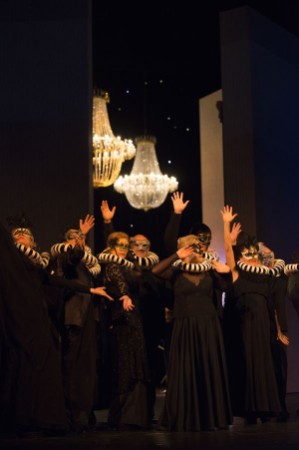 Interessant ist dieser Ansatz – aber leider nicht zu Ende gesponnen – dazu müsste beim eigentlichen Maskenball nicht nur der Adel in zeitgemäßem Outfit auftreten, sondern eben auch Riccardo im Kostüm, was er nicht tut. Zudem ist das alles, was Ryser eingefallen zu sein scheint. Die Personenregie ist quasi nicht vorhanden, konsequent kommt es zu keinerlei Interaktionen zwischen den Handelnden, stetig wird das Publikum angesungen, selbt in den innigsten Momenten der Liebesduette. So kann die Regie nicht wirklich überzeugen, dennoch gelingen vor allem mittels ausgefeilter Bühnentechnik, sich herab senkendem Firmament und wunderbar stimmungsvollem Licht eindrucksvolle Bilder, die aber eher der Ausstattung, denn der Inszenierung zu verdanken sind und eher das Auge des Zuschauers erfreuen, als ihm eine spannende Umsetzung zu bieten.