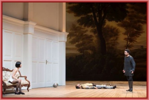 Neben ihrer überzeugenden szenischen Interpretation brillierte La Bartoli mit der von ihr erwarteten, hochindividuellen Koloraturtechnik (hinreißend eine Art „Schwipslied“ im 1. Akt!), doch musste man auch feststellen, dass ihre Mittellage und Tiefe bei getragen zu phrasierenden musikalischen Momenten schon recht schwach klingt. Großartig war Christophe Dumaux, der dem fiesen Polinesso seinen brillant geführten Countertenor lieh, der auch extremen Höhen mühelos dramatische Expressivität verlieh. Kathryn Lewek schenkte der Ginevra viel Spielfreude und Ausdruck; ihre gesangliche Leistung war ordentlich, wurde aber durch etliche steife Spitzentöne verunziert. In der etwas undankbaren Partie der Dalinda wusste sich Sandrine Piau in ihren wenigen Arien überzeugend durchzusetzen. Nach der Erwähnung von Kristofer Lundin als Edoardo, einem Gefolgsmann des Königs, muss die Rede wohl oder übel auf zwei Darbietungen kommen, die dem Niveau des Abends nicht entsprachen: Rolando Villazón als Ariodantes Bruder Lucarnio, der Dalinda liebt, von Ginevras Verrat überzeugt ist und Polinesso schließlich im Zweikampf niederstreckt, plagte sich mit brüchiger Stimme über alle Maßen mit den Koloraturen, von etwas höher liegenden Tönen ganz zu schweigen. Und der Bassbariton Nathan Berg mag für den ruppigen schottischen König die richtige Stimmfarbe haben, aber nur zu bellen war denn auch reichlich übertrieben.