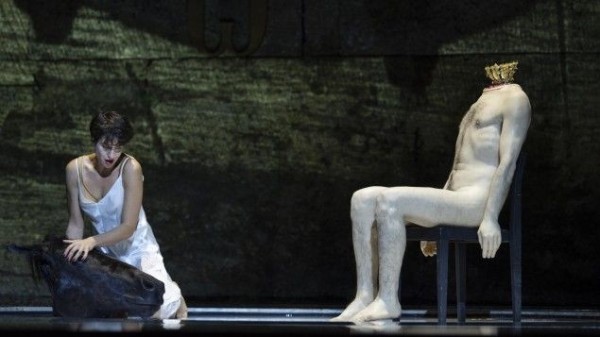 Bei immerhin schon einigen erlebten „Salome“-Inszenierungen erschien mir noch nie so schlüssig und nachhaltig klar, wie sehr ihre Abweisung durch Jochanaan das grausame Ende der Oper bestimmt. Das geht hier wie ein Pfeil durch das Geschehen, auch wenn Salome gar nicht agiert, sondern in einer Ecke kauert – und das ganz unabhängig von all den Nebenpersonen und -schauplätzen. Castellucci hat dies auf der sexuellen Ebene meines Erachtens noch damit akzentuiert, dass er Salome zur ja recht langen Abgangs-Musik des Propheten in die Zisterne einen völlig beinfreien erotischen „Tanz“ im Liegen vollführen lässt. Dieser endet ganz offensichtlich mit einem Orgasmus, aus dessen Erschöpfung sie erst erwacht, als Herodes mit seiner Entourage samt Hoffotograf polternd auf die Bühne kommt. DAS war für mich Salomes Tanz! Ein Tanz für Jochanaan! Zuvor hat sie sich den Pferdesattel übergezogen, der ihr von einem der Helfer des Jochanan entgegen geworfen wurde und unter dem sie nun relativ eindeutige Bewegungen vollführt – auch das wohl eine Form ihres sexuellen Angebots an Jochanaan. Denn vorher sind sie sich einen kurzen Moment ganz nahe gekommen, in dem er sie sogar leicht umarmte, um sie dann sofort wieder von sich zu stoßen – eine nachdenkenswerte und völlig offene Szene, mit der uns der Regisseur in gewisse Zweifel bringt.