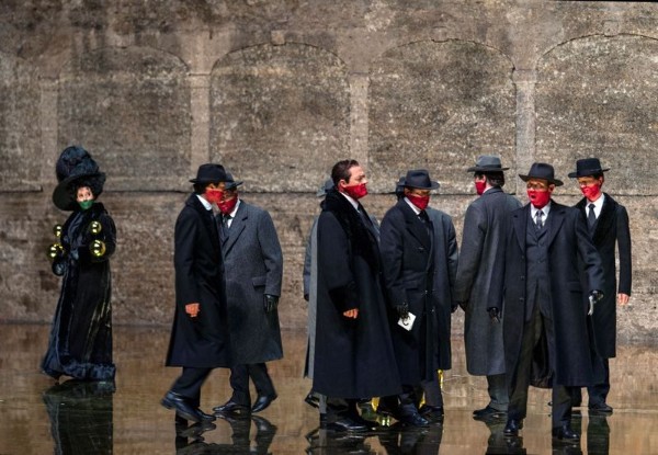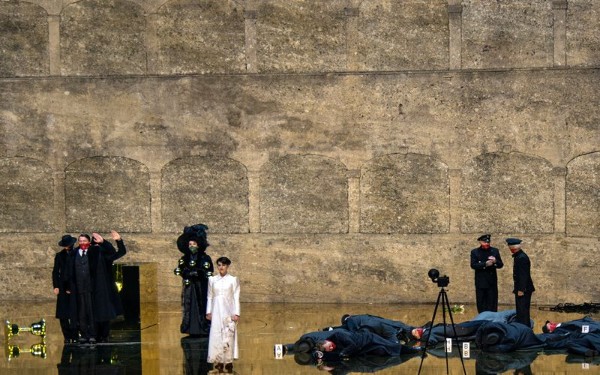 So wird bereits der Boden gereinigt, obwohl noch gar kein Blut darauf geflossen ist, zumal die sicher gewaltsam ins Jenseits Beförderten sorgsam verpackt in Plastiksäcken entsorgt werden. Oder eine Gruppe von Vermessern der Felsenreitschule, also des Tempelgartens, tritt ein und macht ihre Sache kaum halb, wobei man ohnehin nicht weiß, warum. Zwei Boxer stellen sich auf, kämpfen aber gar nicht und gehen unverrichteter Dinge wieder ab. Die Musiker einer kleinen Kapelle rühren keinen Finger (Gott sei Dank!) und verschwinden wieder, zusammen mit den nicht genutzten Stehlampen, die aus dem Film „Arsen und Spitzenhäubchen“ aus dem Jahre 1944 stammen könnten…