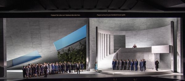 So wie es sich damals um eine der historischen Epoche Rechnung tragende Inszenierung handelte, so war sie fast 60 Jahre später „selbstverständlich“ zeitversetzt. Tatsächlich geht es um eine Handlung, wie sie sich auch – und gerade – heute abspielen könnte, sieht sich der Doge Boccanegra doch gezwungen, einen großen Aufruf für „Frieden“ und „Liebe“ an die einander bekämpfenden Parteien zu machen: Ob das Patrizier gegen Plebejer oder Rechte gegen Linke sind, spielt ja nun wirklich keine Rolle. Hier geht es auch um Genua gegen Venedig – ein blinder Lokalpatriotismus, den man in größerem Maßstab durchaus mit Nationalismus übersetzen kann.