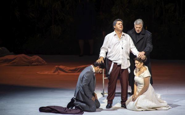 Die musikalische Umsetzung war, mit winzigen Abstrichen, auf dem hohen Niveau, das man sich von diesen Festspielen erwarten – und nicht nur erhoffen – darf. Valery Gergiev ließ eine spannende, manchmal ein wenig rustikale Interpretation hören, die von den mit dem Werk bestens bekannten Wiener Philharmonikern in wundersamer Schönheit umgesetzt wurde. (Dass Gergiev den Gesangssolisten praktisch keine Einsätze gibt, wird von den opernerfahrenen Musikern spielend aufgefangen). Luca Salsi in der Titelrolle bot eine Interpretation, die in der Erinnerung bleiben wird. Es gab nicht nur die volle, schön timbrierte, die Register untadelig wechselnde Baritonstimme zu hören, sondern auch einen Gestalter voller vokaler Nuancen, welche die von der Regie teils um ihre menschliche Größe gebrachte Figur zu voller Entfaltung brachten. Mehr als imposant auch René Pape als Boccanegras rachsüchtiger Gegenspieler Fiesco. Es war nicht nur eine Freude, anstelle der heute für die Rolle oft eingesetzten Bassbaritone einen echten Vertreter des verlangten Stimmfachs zu hören, sondern auch ein Genuss, die psychologischen Farben zu verfolgen, die der Künstler ab der Auftrittsarie in die Rolle einbrachte. Als Adorno war Charles Castronovo szenisch das Abbild eines testosterongesteuerten Jünglings; seine Stimme ist dramatischer geworden.