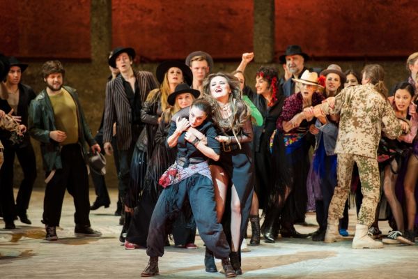 Mit wenigen, in immer wieder zueinander wechselnden Stellungen, die riesige Bühne füllenden Containern baute der englische Bühnenbildner Peter J. Davison einmal den von Bandenmitgliedern bewachten Lagerplatz eines Drogenkartells, die Spelunke, die wilde Gegend im Irgendwo einer heutigen, von Bandenkriegen betroffenen Welt und die Arena, in welcher Don José nach dem Mord siegestrunken und halluzunierend sich im Beifall des sensationsgierigen Publikums sonnt.