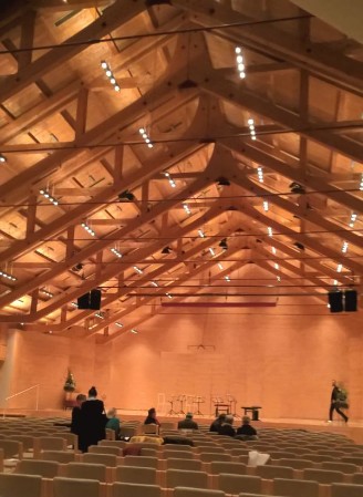 Der „Schuhschachtel-Konzertsaal“ ist mit einem offenen Flach-Satteldach abgedeckt, so dass die Leimbinder-Stützkonstruktion sichtbar bleibt. Seitlich vom Podium sind schräge Holzreflexwände angeordnet und hinter den Musikern war ein den Schall reflektierender Paravent aufgestellt. Interessanterweise haben auch die Panorama-Doppelglasfenster keinen gravierenden Einfluss auf die Klangentwicklung. Außerdem verfügt der Saal über eine ausgezeichnete Belüftungsanlage und im hinteren Bereich über eine Galerie.
