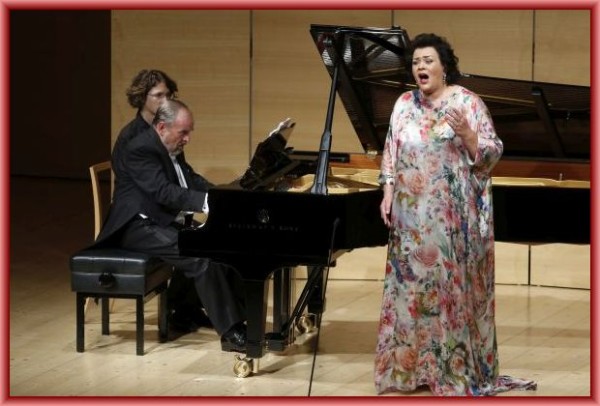 Am Abend beglückten Violeta Urmana und Helmut Deutsch mit einem klassischen Programm: Schubert, Mahler und Strauss. Vom zupackenden Vorspiel des Pianisten an disziplinierte Violeta Urmana ihren zum Sopran neigenden Opern-Mezzo gekonnt; sie offerierte die zehn Naturbilder Schuberts mit größter Natürlichkeit, so dass schon zur Pause emphatischer Jubel aufbrandete. Das lag auch am letzten Lied, an der ausdrucksstarken Gestaltung des „Erlkönigs“, die der Begleiter besonders hart mit stets Unruhe suggerierendem Pochen anging, während die Sängerin die verschiedenen Personen hervorragend charakteristisch herausarbeitete. In „Erlafsee“ beispielsweise „kräuselten“ beide kongenial das „Gewässer“ durch „frische Winde“. Die fünf Rückert-Lieder von Gustav Mahler wurden von dem Duo sehr spannend teils mit viel Ruhe („Ich atmet’ einen linden Duft“), teils mit dramatischen Aufschwüngen („Um Mitternacht“) bestens dargeboten. Die Strauss-Lieder und überhaupt den ganzen Abend könnte man unter dem Aspekt der Schlusszeile des Liedes „Wie sollten wir geheim sie halten“ sehen: „…bis in die tiefsten Falten sei allen unser Herz enthüllt“. Wie immer in Schwarzenberg belohnten drei Zugaben den stürmischen Applaus. (ME)