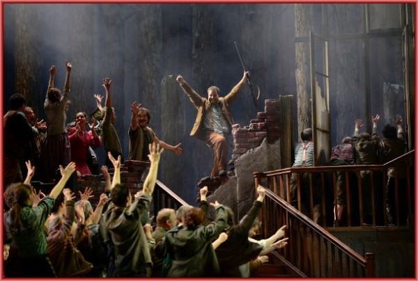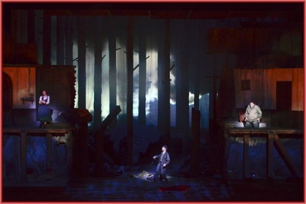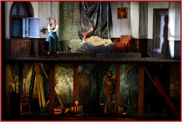 Natürlich gehört sie auch den Sängern. Bei aller Dominanz des opulenten Bühnenbilds bleiben die Protagonisten (meist…) kenntlich, und dies auch, weil ihre Stimmen interessant sind; allein die Stimmen zeichnen, wenn man’s genau betrachtet, die Charaktere. Marco Jentzschs Max ist ein betont lyrischer Typ, genauer: er kommt als italienischer Tenor daher, der mit einem deutlichen lagrimoso sein latent militaristisches Outfit zu konterkarieren scheint. Mit Christiane Kohl (die der Bayreuther Opernfeind erst im letzten Sommer als Helmwige und Dritte Norn erblickte) hat sich die Semperoper eine artikulatorisch extrem klar, im streng klassischen Sinne vielleicht nicht einmal lupenrein singende Agathe ins Haus geholt, die durch etwas entzückt, was frühere Zeiten – nicht zu Unrecht – als „innig“ bezeichneten. Und so singt sie denn ihr Leise, leise… in der Dachkammer des teils kriegszerstörten Hauses: im angedeuteten Trachtenkleid – und mit sehr viel Sinnlichkeit.