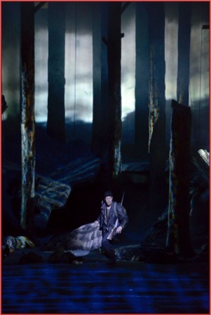 Und Ännchen? Ännchen ist gut, nein: sehr gut über den Krieg gekommen, denn auch die Stimme hat absolut nicht gelitten. Menna Cazel versieht die kapriziöse wie ehrliche Partei dieser kleinbürgerlichen Begleiterin mit einem hörbaren Tremolo, das nicht jedem Hörer gefallen muss – dem Rezensenten hat es gefallen. Sebastian Wartig singt einen höchst ordentlichen Ottokar, Tilmann Rönnebeck einen guten Kuno, Bernhard Hansky den Kilian. Bleibt der Eremit – das heißt: Wilhelm Schwinghammer – dessen noch jedes Mal bewegender Auftritt allein von Webers Musikdramaturgie beglaubigt wird. Denn dass das Erscheinen des Eremiten, diesem Nachfolger des alten deus ex machina, problematisch ist, wenn man ihn allein aus der Perspektive der gegenwärtigen Ideologiekritik betrachtet, liegt auf der Hand. Hier, wo sich Aufklärung und Gegenaufklärung des frühen 19. Jahrhunderts verschränken, in dem sich in Preußen Thron und Altar mit allen bekannten Folgen verbündeten, findet der Regisseur Axel Köhler nun zu einer originellen Lösung. Er behauptet, zusammen mit seinem Bühnenbildner Arne Walther und der Kostümgestalterin Katharina Wesselborn, erst gar nicht, dass diese Inszenierung realistisch aufgefasst werden will. Sie arbeitet „nur“ mit Versatzstücken aus Wirklichkeit und Fantasie – und reagiert damit produktiv auf Webers und Kinds Mischung einer sozialgeschichtlichen Nachkriegswirklichkeit des 17./19. Jahrhunderts und der puren fantasy aus der Zeit der literarischen und bildkünstlerischen Gruselromantik; dass E. T. A. Hoffmann ein Zeitgenosse Webers war und (angeblich) Rezensionen zum Werk schrieb, ist kein Zufall. Bei Köhler spielt die erste Schicht des Werks zunächst in einer Art Nachkriegsdeutschland, vielleicht auch im zerstörten Nachkriegs-Dresden, doch wohl eher in einem weniger vernichteten Außenbezirk wie Tolkewitz. Hinter dem grauen Hof aber stehen immer noch die Bäume, die letzten Repräsentanten jenes „deutschen Waldes“, in den Weber sein nur scheinbar in Böhmen spielendes Drama hineingesetzt hat: vor allem durch die Musik, den typischen Hörnerklang der Romantik, die „Innigkeit“, aber auch die Gemeinheit, die Bosheit, die Verzweiflung, den Krieg. Auch die Bäume scheinen Kriegsopfer zu sein. Mit ihren kahlen Stämmen erinnern sie an Gewächse auf heutigen Truppenübungsplätzen, aber gemeint ist offensichtlich etwas Anderes: der Wald ist eine Erinnerung – und das Bild ist surreal. Es ist so surreal wie die Wolfsschlucht, bei deren Inszenierung die Regie und die Ausstattung alle Lizenzen haben. In die Dresdner Wolfsschlucht dringen die Bilder jenes Krieges ein, der dafür gesorgt hat, dass nicht nur die Häuser, sondern auch die Seelen kaputt sind; kein Wunder, dass die Männer während des bemerkenswert einschichtigen – und doch großartig komponierten – Ländlers gruppenweise aufeinander losgehen. Die Ordnung der Nachkriegszeit schält sich vorerst in bewaffneten Konflikten heraus. Die Vision der Wolfsschlucht erzählt die Vorgeschichte dieser politisch-gesellschaftlichen Verwerfungen und gerät doch nicht in Widerspruch zu Text und Musik der Oper. Die Wolfsschlucht: das ist ein Wald der Gehenkten, sind Flugzeugangriffe, sind feindliche Soldaten. Nicht fehlt: nicht der vom Himmel geschossene Rauvogel, nicht die archaischen Freikugeln – und nicht die Erinnerung an die Gegenwart eines Weber – bezeichnenderweise trägt allein der konfliktlösende Eremit den Rock der 1820er Jahre – und eines heutigen Zuschauers.