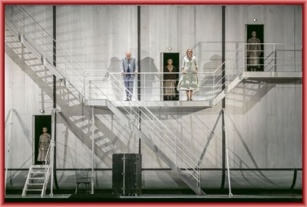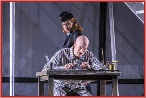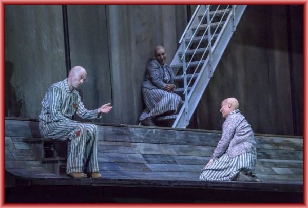 Insgesamt ist es dem Regisseur um eine Mischung aus realistischen und abstrakten Elementen zu tun. Zudem ist seine Regiearbeit auch psychologisch angehaucht. Die stilistische Gratwanderung, die er vollführt, ist vollauf überzeugend. Das Geschehen wird aus der Perspektive Lisas heraus interpretiert, die offensichtlich unter einer ausgemachten Psychose leidet und vergeblich versucht, die schlimme Vergangenheit zu verdrängen. Katja Haß hat für das Bühnenbild eine praktikable, einleuchtende Lösung gefunden: Die Bühne wird von einem riesigen Kubus eingenommen, dessen Außenseite das Schiff mit den zu den verschiedenen Decks führenden Eisentreppen darstellt. Immer wieder erscheinen KZ-Häftlinge in den Türen. Wenn sich der Kubus dreht, erblickt man auf seiner Innenseite Auschwitz, dessen Rückwand von einem riesigen Tor gebildet wird. Dort sitzen die teils glatzköpfigen, teils mit Kopftüchern versehenen Frauen in von Bettina Walter geschaffenen karierten Häftlingsanzügen mit roten Winkeln und in Decken gehüllt an der Wand. Sobald ein SS-Mann oder eine Wärterin den Raum betreten, springen sie rasch auf, formieren sich in der Raummitte und nehmen Haltung an. Gekonnt werden von der Regie unterschiedliche Zeit- und Raumebenen miteinander verzahnt. Die Konturen des Dampfers und von Auschwitz sind fließend, was insbesondere dann deutlich wird, wenn Walter immer wieder mit einer Pfeife oder einem Buch bewaffnet auch im KZ-Bereich umhergeht, das Entsetzliche, das ihn umgibt, dabei aber gar nicht wahrzunehmen scheint. Auch Lisa pendelt oftmals zwischen Außenbereich (Schiff) und Innenbereich (Auschwitz) hin und her. Diese Verschränkung der Ebenen ist psychologisch einleuchtend. In dem Maße, wie Lisa sich immer mehr von ihrer Vergangenheit als KZ-Wärterin eingeholt sieht, wird Walter zunehmend in die Welt von Auschwitz hineingezogen. Hier bieten sich dem Auge ungemein starke Eindrücke. Ihren Höhepunkt erreicht Webers Regiearbeit gegen Ende beim Ball auf dem Schiff: Es gehört zu den eindringlichsten Momenten der Inszenierung, wenn Marta nach dem Tanz auf Lisa zugeht und sich unvermittelt die Perücke herunterreißt und ihr glatzköpfiges Haupt zur Schau stellt. Während Lisa ohnmächtig zusammenbricht, beginnen nun auch die anderen Ballgäste ihre eleganten Kleider und Anzüge abzulegen. Sie platzieren diese sauber auf einen Haufen und legen zum „Konzert“-Bild Häftlingskleider an. Das Schiff ist unvermittelt zu Auschwitz mutiert. Während sich Lisa in ihrem Ballkleid an den rechten Bühnenrand kauert, sucht Walter das Weite. Er kann an diesem schrecklichen Ort nicht bleiben. Bevor er die Bach-Chaconne spielt, küsst Tadeusz Marta noch einmal. Das war alles sehr überzeugend und mit Hilfe einer eindringlichen Personenregie auch erstklassig umgesetzt.