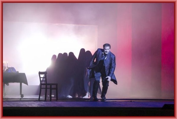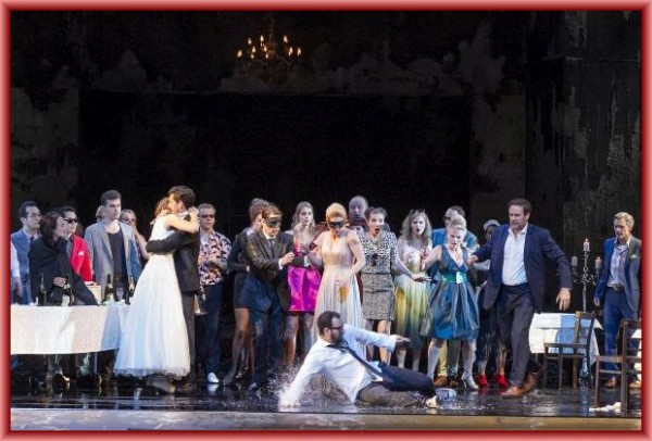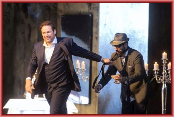 In Dresden spielte man die Wiener Fassung, also ohne das Schluss-Sextett, dafür mit Elviras „Mi tradi quell’alma ingrata“, Ottavios „Dalla sua pace“ anstelle von „Il mio tesoro“ und mit dem sonst stets gestrichenen Duett Zerlina/Leporello, das die Handlung überhaupt nicht weiterführt. Andreas Kriegenburg hatte die Geschichte um den zugrunde gehenden Frauenheld in die Gegenwart verlegt, und zwar in eine dekadente Gesellschaft, die sich nur dem Rausch und äußeren Genüssen hingibt. Das zeigte sich gleich nach der mit Konzertschluss endenden Ouvertüre, als man Leporello in einer exklusiven Model-Agentur sah, wie er langbeinige Bewerberinnen taxierte. Ebenfalls in diesem Ambiente schliefen Don Giovanni, Leporello und die leicht bekleideten Models (Kostüme: Tanja Hofmann) nach dem Fest am Schluss des 2. Akts ihren Rausch aus. Ansonsten spielte alles in einem dunklen, reichlich heruntergekommenen Ambiente, vielleicht einer Art Disco, nachdem die Agentur jeweils nach oben gefahren war. Hier fanden alle übrigen Begegnungen und Vergnügungen statt, meist bei Kerzenlicht (Bühnenbild: Harald Thor). Da die Agentur hell beleuchtet war, misslangen die Verkleidungsszenen völlig; denn dass Elvira und anschließend Masetto Giovannis Versteckspiel nicht durchschaut haben, konnte man nun wirklich nicht annehmen. Wenn es so sein sollte, dass Elvira sich bewusst darauf eingelassen hat, wie der Regisseur im Programmheft andeutet, konnte man das in der Darstellung in keiner Weise erkennen. Die Friedhofsszene war dann nur noch albern, wenn der Komtur in einer großen, fahrbaren Möbelkiste sitzt. Woran Giovanni schließlich stirbt, blieb offen; einige Krämpfe schon zum Finale des 2. Aktes ließen Herzinfarkt vermuten. Vielleicht war sein Ende aber auch durch eine Überdosis Rauschgift verursacht, als ihn die mit schwarzen Umhängen versehenen Models in ein imaginäres Feuer im Bühnenhintergrund hinab zogen.
