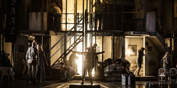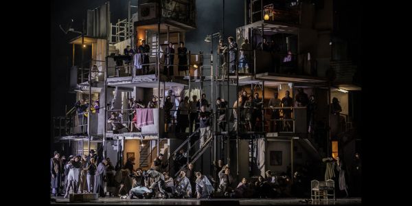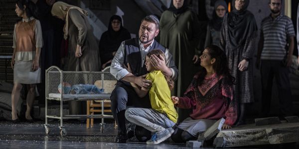 Wie von der Deutschen Oper Berlin ausgeborgt wirkt die Bühne von Patrick Bannwart für Verdis Dramma lirico Nabucco an der Semperoper. Der turmartige Aufbau von ärmlichen Flüchtlingsquartieren in vier Etagen ist ein ebenso abgegriffenes Bild wie später die verkohlte Ruinenlandschaft oder das Krankenbett für Nabucco in einer psychiatrischen Klinik.