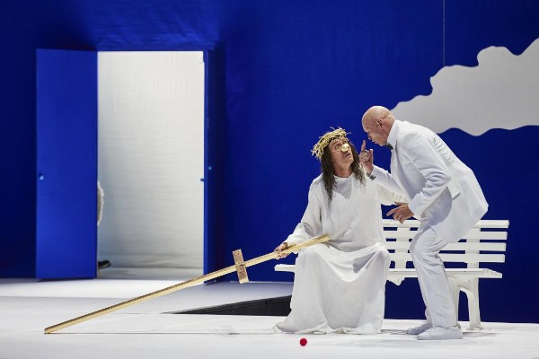 Was im ersten Teil schlaglichtartig aufkommt, entwickelte sich im zweiten Teil der Inszenierung zum Feuerwerk der Ideen. Ganze Teile des Geschehens einfach in den Himmel zu verorten oder gleich dem Teufel zu überlassen, war schon genialisch. Eine Wasserkanone, viel Grünes rundeten die aktuellen Bezüge und ließen den zweiten Teil zum Hochgeschwindigkeitstheater auflaufen.
