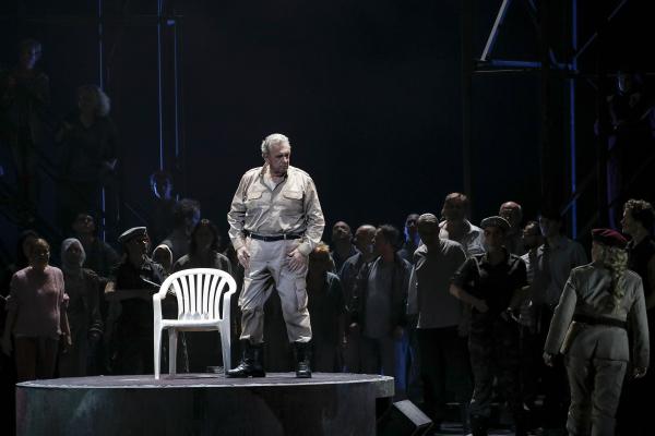 Sehr viel ist zu David Böschs Nabucco-Inszenierung an der Semperoper Dresden nicht zusagen. So wie die Soldaten des babylonischen Herrschers Nabü-kudurrï-ușur II. ( um 640 v. Chr. Bis 562 v. Chr. ) im Jahre 595 v. Chr. Jerusalem nach langer Belagerung eroberten, werden ideologische oder religiöse Unterschiede noch immer als Vorwände für kriegerische Auseinandersetzungen zwischen Volksgruppen oder für Bürgerkriege genutzt. Sind doch offenbar große Teile der Menschheit im Verlaufe der letzten zweieinhalb Jahrtausende kaum klüger geworden. Deshalb war es für Bösch einfach, den Hebräern und Babyloniern Verdis Uniformen und zeitgenössische Kleidung anziehen (Kostüme: Meentje Nielsen) und sie in einer Ruinenstadt unserer Zeit agieren zu lassen. Damit dürfte die Inszenierung deutlich näher am biblisch überlieferten Geschehen bleiben, als das Libretto von Temistocle Solera. Patrick Bannwart stellte eine an den Turmbau von Babel erinnernde Stahlbau-Ruine auf die Bühne und konfrontiert uns mit Fernsehbildern unserer Tage aus Syrien, dem Irak, der Ost-Ukraine oder Jemen. Der Turm, vertikal geteilt und an die Bühnenränder verschoben, bildete für die weitere Vorstellung die Spielfläche.