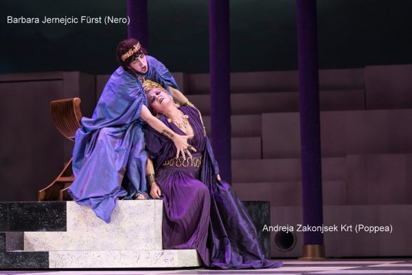Die junge, aus Apulien stammende Sopranistin Silvia Susan Rosato Franchini war die betrogene Kaiserin Octavia. Ihr Lamento A, a, a, addio Roma im letzten Akt mit seinen abgerissenen, fast atemlos hervor gestoßenen Gesangsfetzen hat in der gesamten Geschichte der Oper wohl kaum seinesgleichen. Und dieses Lamento gestaltete sie außerordentlich berührend mit individuell gefärbtem Sopran und großer Intensität – klug unterstützt durch die Regie, die sie vor diesem verzweifelten Abschied durch den Zuschauerraum wanken ließ. Ottone war der deutsche Countertenor Joachim Stegmann , der seine Szenen mit klarer Artikulation sehr schön präsentierte. Nero war die aus Ljubljana stammende Barbara Jernejčič Fürst , die sich vor allem als Konzertsängerin auf dem Gebiet der alten und neuen Musik einen Namen gemacht hat und die inzwischen Dozentin an der Musikakademie in Ljubljana ist. In ihrer Interpretation ist Nero – in exzellenter Maske – eher ein resignativ-melancholischer Charakter, der durch Poppea getrieben ist. Mit ihrer schlanken, stets technisch sauber geführten Stimme singt sie die Partie makellos. In der Stimmfarbe erinnert sie mich ein wenig an Magdalena Kožená, die ich in dieser Partie vor etwa 10 Jahren im Theater an der Wien erlebt hatte. Barbara Jernejčič Fürst bietet als Nero eine Leistung auf internationalem Niveau. Ein weiterer Gast aus Ljubljana ist der junge Tenor Klemen Torkar, der in der dankbaren Rolle der Amme Arnalta stimmlich und darstellerisch brilliert.