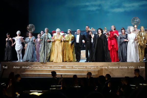 Marburg bietet ein Kontrastprogramm: Nach der chinesischen Prinzessin Turandot in Puccinischer Üppigkeit steht nun etwa ein Monat später mit der römischen Kurtisane Poppea in Monteverdischer prächtiger Herbheit eine weitere dominierende Frau auf der Bühne – im ewigen Spiel um Liebe und Tod. Streng genommen kommt Amor wohl in jeder Oper vor, doch nicht überall tritt er leibhaftig auf. Allerdings zu Beginn der Operngeschichte beherrscht er das Geschehen: Schon in Jacopo Peris Dafne – der ersten Oper in der Musikgeschichte – beschwört Amor nach einem Streit mit seiner Mutter Venus das traurige Schicksal der Nymphe Dafne herauf und in Monteverdis rund 50 Jahre später entstandener letzter Oper verhindert er den Mord an Poppea, damit die Oper glücklich enden kann. Der erfahrene kroatische Regisseur Krešimir Dolenčić hat in seiner Inszenierung die Figur das Amor aufgewertet – Amor ist praktisch immer auf der Bühne und zieht gemeinsam mit der neu eingeführten stummen Rolle des Todes die Fäden der Handlung. Die szenische Umsetzung des Monteverdischen Meisterwerkes, das am Übergang von der Renaissance zum Barock steht, ist geprägt von den wunderbaren und üppigen Kostümen in klaren Farben (Ana Savić-Gecan) in einer sparsam-praktikablen Ausstattung (Tanja Lacko) und von einer klaren, gestenreichen, aber nie stereotyp-platten Personenführung. Goethe hat von der sinnlich-sittlichen Wirkung der Farbe gesprochen – und das kann man in dieser Inszenierung bildhaft erleben: Amor und die Götterwelt in Weiß, der Tod in Schwarz, die zu Beginn erscheinende Fortuna in geteiltem Scharz-Weiß, Senecas Kostüm wandelt sich vom distanziert-diskret pfirsichfarbenen Kleid des Philosophen in der Todesszene in eine blutrote Toga, die Kaiserin Octavia tritt zunächst in lebensfrohem Orange auf, bevor sie in völligem Schwarz ihren Abschied aus Rom beklagt. Nero ist in Königsblau gewandet, seit dem 13. Jahrhundert die Farbe der französischen Königsmäntel. Und Nero wird das ganze Stück hindurch durch eine goldene Löwenfigur begleitet, um seine Machtstellung zu illustrieren.