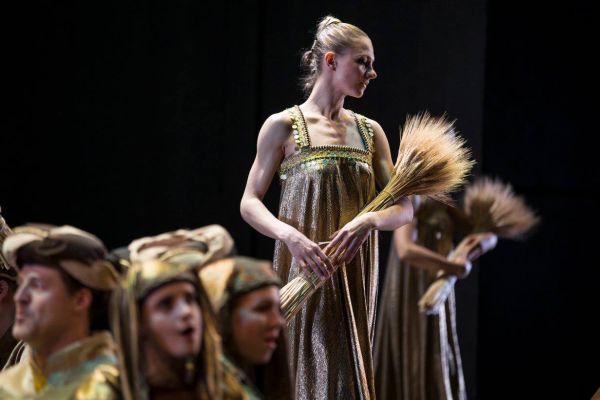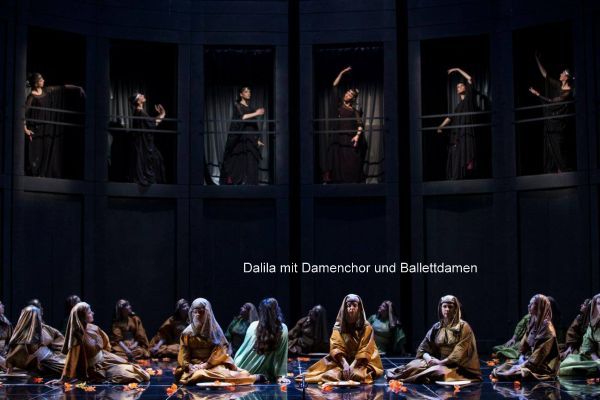 Die Frau, die den Helden – gemeinsam mit den Mädchen ihres Gefolges – umgarnt und verführt, ist die noch nicht 30-jährige Argentinierin Guadelupe Barrientos. Sie leistet Erstaunliches! Die Regie und die Choreographie haben ihr ausnehmend harmlos-biedere Tänzerinnen beigegeben. In der 6.Szene des 1.Aktes lautet im Libretto die Szenenanweisung für den Tanz der Priesterinnen: Die jungen Mädchen in Dalilas Gefolge tanzen und bewegen anmutig ihre Blumengirlanden, womit sie die hebräischen Krieger um Samson zu reizen scheinen. Samson, leidenschaftlich erregt, versucht vergeblich, Dalilas Blicken auszuweichen. Widerstrebend folgen seine Augen allen Bewegungen der Verführerin, die inmitten der jungen Philisterinnen mit sinnlichen Posen und Gebärden tanzt. Das sieht in dieser Inszenierung so aus: