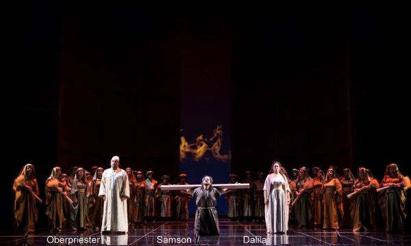 Aber der Schluss der Oper ist dann effektvoll gestaltet: Der blinde Samson wird zunächst unter ein großes Holzjoch gezwungen, verhöhnt, dann aus einer Opferschale mit Blut übergossen und letztlich zu dem im Hintergrund lodernden Feuer geführt. Samson wirft das Joch ab, wird aber mit Seilen an die Mauern des Tempels gebunden. Mit letzter Kraftanstrengung ruft Samson seinen Gott an: „Daigne pour un instant, Seigneur, me rendre ma force première!“, zerrt an den Seilen und bringt das gesamte Bühnenbild zum Einsturz, das alle unter sich begräbt – eine sehr eindrucksvolle und bühnenwirksame Schlussszene!