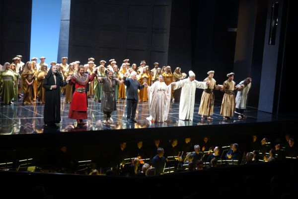 Der in Marburg schon aus vielen Inszenierungen bekannte Paul-Émile Fourny ist nicht nur der Regisseur des Abends – er ist auch der Koproduzent dieser Inszenierung, ist er doch der Intendant der Opéra de Metz, mit der Marburg auch diesmal wieder zusammenarbeitet und wohin diese Inszenierung in der nächsten Saison übersiedelt. Das Marburger Orchester wurde diesmal vom irisch-französischen Dirigenten Robert Houlihan geleitet – es war eine ordentliche, aber doch ein wenig gleichförmige und wenig profilierte Interpretation, die die klangliche und rhythmische Raffinesse des Werks nicht ausschöpfte. Man weiß, dass Camille Saint-Saëns das Werk ursprünglich als Oratorium geplant hatte – das merkt man speziell in den Akten 1 und 3, in denen der Chor große Aufgaben hat. Diese bewältigte der groß besetzte Marburger Chor (Einstudierung: Zsuzsa Budavari Novak) klangschön und stimmkräftig. Die Nebenrollen waren aus dem Marburger Haus besetzt: Jure Počkaj war stimmlich ein sehr guter, darstellerisch wenig profilierter Abimelek, Alfonz Kodrič ein eindringlicher alter Hebräer mit etwas ungehobeltem Bass und Jaki Jurgec ein stimmlich allzu leichtgewichtiger Oberpriester. Am Ende gab es im ausverkauften Haus viel Beifall – vor allem natürlich für Guadelupe Barrientos und Jean-Pierre Furlan – wegen dieser beiden Leistungen lohnt es sich unbedingt, diese Produktion zu besuchen!