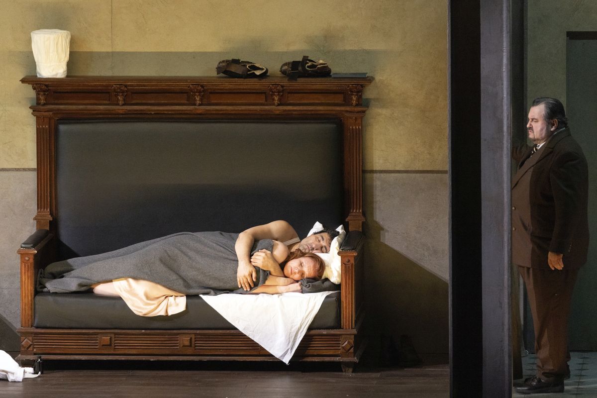 In der musikalischen Realisierung war bei jedem Takt zu merken, wie sehr Riccardo Chailly das Werk am Herzen liegt, und das Orchester des Hauses mobilisierte alle Kräfte, um ihm bis zur Erschöpfung zu folgen. Die gesamte Wucht und Kühnheit von Schostakowitschs Komposition kam zur Geltung. (Dass mich Maris Jansons Leitung 2017 in Salzburg noch mehr beeindruckt hat, ist eine rein persönliche Vorliebe). Einmal mehr ist der von Alberto Malazzi einstudierte Chor des Hauses zu preisen, der nicht nur prachtvoll wie mit einer einzigen Stimme sang, sondern szenisch im Gegenteil einzelne Figuren scharf herausarbeitete. Nach der Absage von Asmik Grigorian war die Amerikanerin Sara Jakubiak für die in jedem Sinne mörderische Titelrolle engagiert worden. Ihr Russisch vermag ich nicht zu beurteilen, aber sie ging gesanglich und szenisch ganz in der Partie auf, musste nie ihre Grenzen überschreiten und hielt bewundernswert bis zum Schluss durch. Die große Persönlichkeit ist ihr nicht gegeben (da fällt mir an der Scala Evelyn Herlitzius ein), aber Chapeau vor der Bewältigung der Riesenaufgabe. Sergej war dem Usbeken Najmiddin Mavlyanov anvertraut, dessen Tenor mir weniger kraftvoll erschien als bei seinem Hermann („Pique-Dame“) 2022 am selben Ort. Er zeichnete aber ein überzeugendes Porträt des nur auf seinen eigenen Vorteil bedachten Proletariers. Ganz ausgezeichnet war der Bass Alexander Roslavets als bösartiger, starrköpfiger Schwiegervater Katerinas, und es war bedauerlich, dass seine Figur nur in den ersten beiden Akten vorkommt. Der grelle Tenor von Evgeny Akimov passte bestens zu Katerinas verschüchtertem Gatten, der es nicht wagt, sich gegen seinen Vater aufzulehnen. Ekaterina Sannikova beeindruckte als bedrängte Aksinja, Elena Maximova als aufreizende Sonetka. Aus dem zahlreichen, in jeder Hinsicht präsenten Personal seien noch Alexander Kravets‘ (Tenor)zerlumpter Bauer, der den Leichnam des getöteten Gatten entdeckt, der schoenstimmige Bass Goderdzi Janelidze als alter Häftling, Valery Gilmanov (Bass) als ewig betrunkener Pope und der Bariton Oleg Budaratsky (die karikierte Figur eines Polizeioffiziers)genannt.