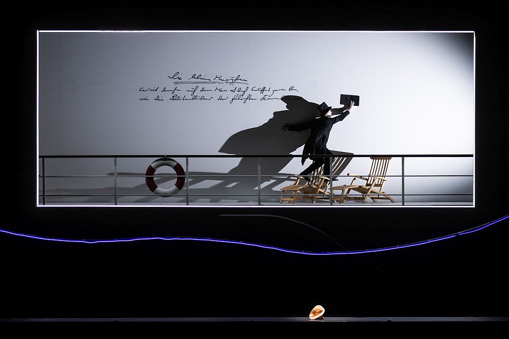 Andersens Märchen beginnt mit dem Satz: „Weit draußen im Meere ist das Wasser so blau wie die Blätter der schönsten Kornblume“. Dieser Satz steht handschriftlich geschrieben am Bühnenhimmel zu Beginn des Ballettabends. Das Bühnenbild dazu erscheint wie eine Postkarte, auf der sich der Dichter in Schwarz unter heller Sonne auf Deck eines Schiffes an der Reling mit Rettungsring bewegt. Dabei entstehen wunderbare Schattenspiele. Mit Hilfe einer oder auch mehrerer, leicht horizontal geschwungenen Lichtline schon auf dem blauen Bühnenvorhang vor Beginn wird im ersten Teil die Position über und unter NN symbolisiert. Das Schiff als Ort des Geschehens wird verdeutlicht, indem situationsabhängig entweder ein kleiner Dampfer mit vier Schornsteinen oben von rechts nach links dampft, oder nach der Katastrophe des Schiffsuntergangs gleich mehrere Schiffe kopfüber im dunkelblauen Meer bewegungslos hoch über dem Meeresboden treiben.