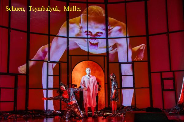 Aber wenn man eine tiefgründige Interpretation erwartet, die dem „Mythos Don Giovanni“ nachspürt, ist man eher enttäuscht. Eine differenzierte Personenführung und eine individuelle Charakterisierung der Figuren bleibt hier eher die Ausnahme, etwa wenn Don Giovanni und Zerlina sich schon bei dem Duett „La ci darem la mano“ spielerisch und in fast kindlicher Freude ihren Gefühlen hingeben. Aber oft wird einfach nur statisch an der Rampe gestanden. Viel Platz ist (im 1. Akt) auch nicht, denn das Bühnenbild von Stéphane Laimé ist mit seinen immer neuen Ansichten von heruntergekommenen Palazzo-Fronten eher etwas erdrückend. Dafür hat Bosse seine Arbeit mit einigen Zutaten „angereichert“. Da ist zum einen die erfundene Figur Amor/Tod – ein androgynes Wesen, das an Fassaden klettert, skurrile Tänze aufführt oder lauernd sie Szenerie beäugt. Anne Müller vollführt das mit beachtlichem körperlichem Einsatz. Aber die Funktion dieser Figur und deren Aussage wird nicht deutlich, was sie letztlich überflüssig macht. Überflüssig sind eigentlich auch die Video-Bilder, die oft über die Fassaden projiziert werden und erst recht der Einsatz einer Live-Kamera, die (zudem noch unsynchron) die Gesichter vergrößert.